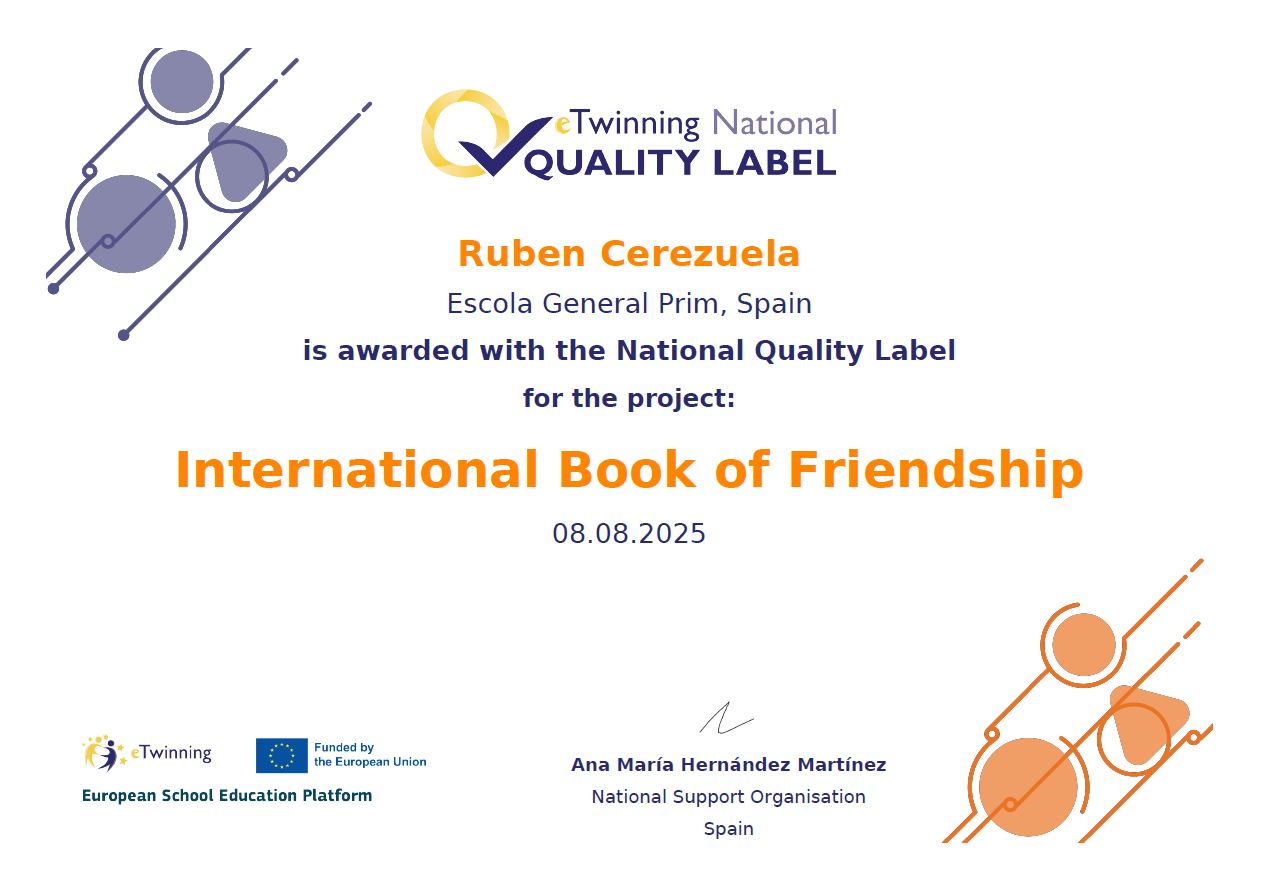 Estem molt contents d’anunciar que dos dels projectes en què vam participar, Great Ball Games (1r) i International Book of Friendship (4t), han estat reconeguts amb el segell de qualitat Quality Label. Aquest guardó destaca la qualitat pedagògica, la creativitat i la col·laboració internacional que s’ha dut a terme, i suposa un reconeixement tant per a l’alumnat com per al professorat implicat.