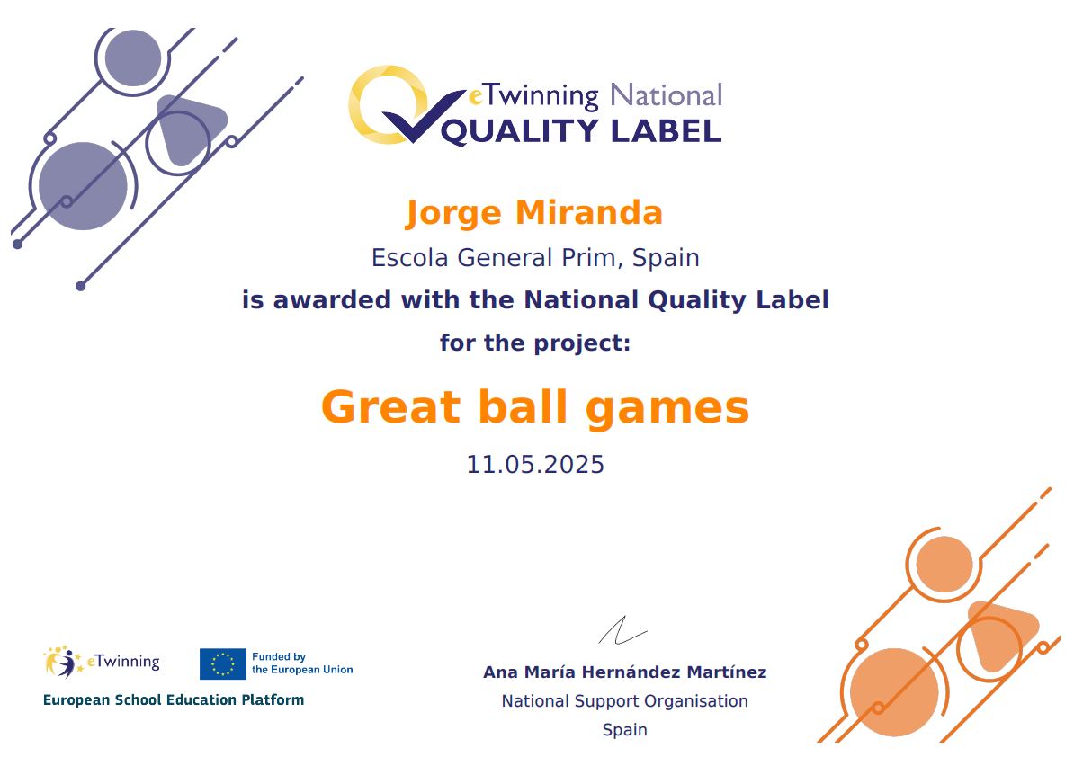 L’Escola General Prim ha estat reconeguda amb el Segell de Qualitat eTwinning, una distinció que posa en valor la participació del centre en projectes educatius europeus, així com el treball col·laboratiu, la innovació pedagògica i el compromís amb una educació oberta i de qualitat.