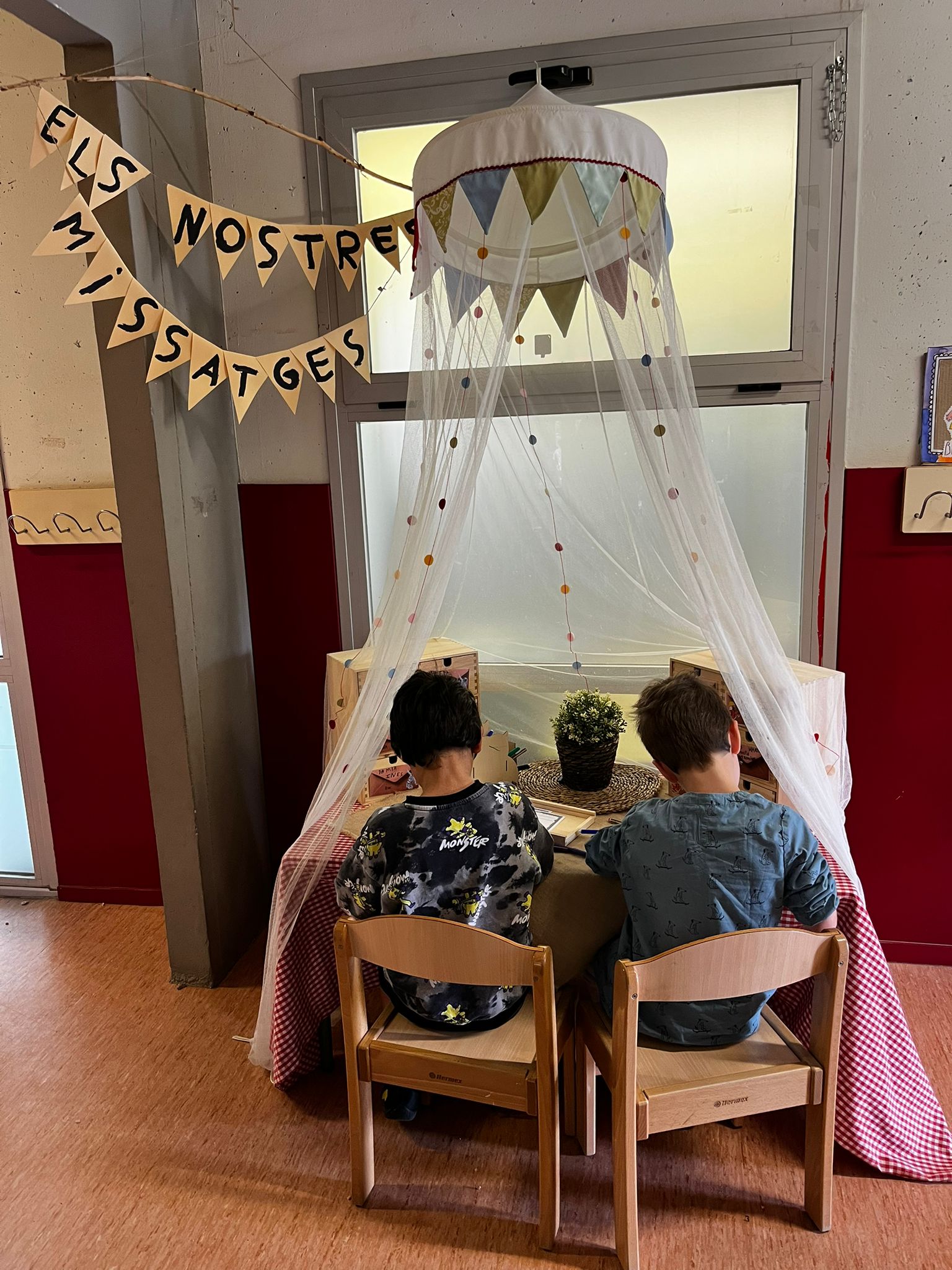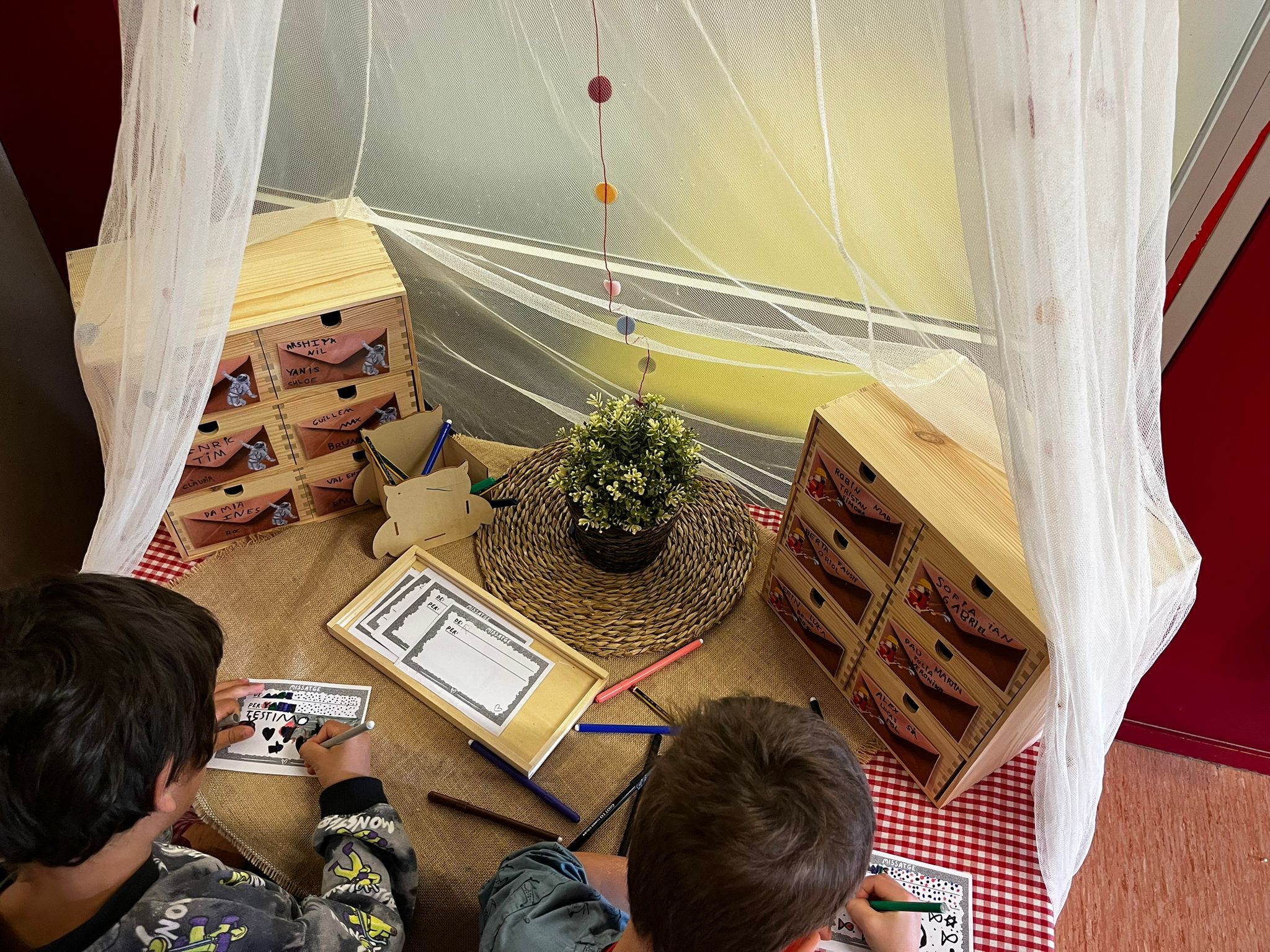 Durant aquestes setmanes, els infants poden agafar lliurement papers de missatges que troben en aquest espai i escriure un missatge bonic a algun amic o amiga de la classe.