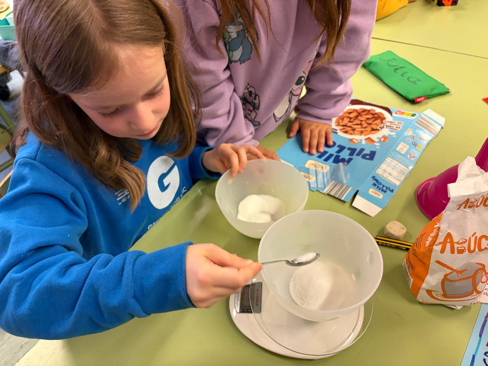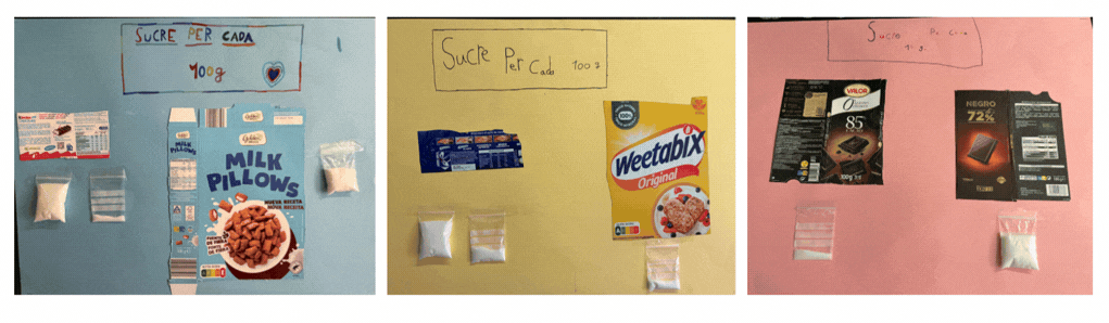 Per comprovar-ho, hem extret la quantitat de sucre per cada 100 grams de diferents aliments i, amb una bàscula i sucre, hem pesat la quantitat real que contenen. Aquesta activitat ens ha ajudat a visualitzar millor quins aliments en porten més i quins en porten menys, i a reflexionar sobre quines opcions són més saludables per al nostre cos.