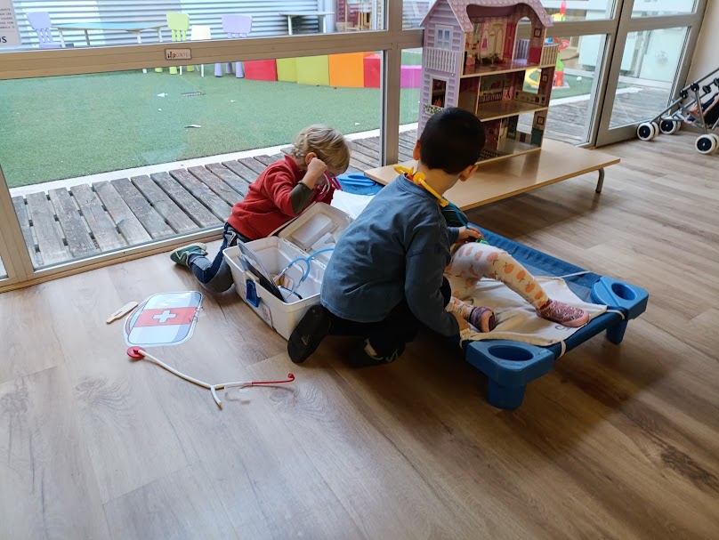 Hi trobem diferents racons que conviden a imaginar, crear i compartir moments de joc, com ara l’hospital, la botiga, la caseta i el racó de disfresses.