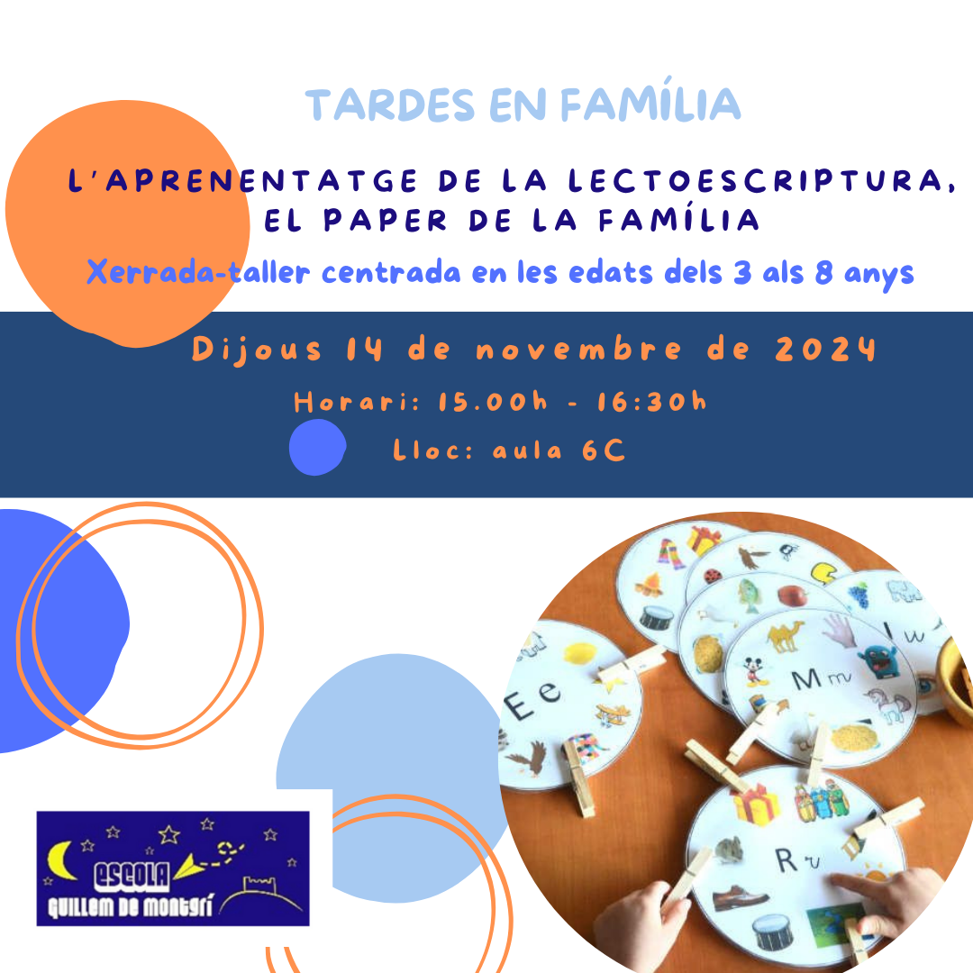 Voleu conèixer com aprenem les persones a llegir i a escriure? Quines habilitats són necessàries per ser uns bons lectors i escriptors? Quines metodologies i tipologies d’activitats apliquem per millorar l’aprenentatge?… En la trobada de “Tardes en Família” d’aquest trimestre donem resposta a aquestes qüestions i a moltes d’altres relacionades amb aquest procés d’aprenentatge tan apassionant, com és la lectoescriptura. Sessió conduïda per l’equip motor lingüístic de l’escola Guillem de Montgrí.