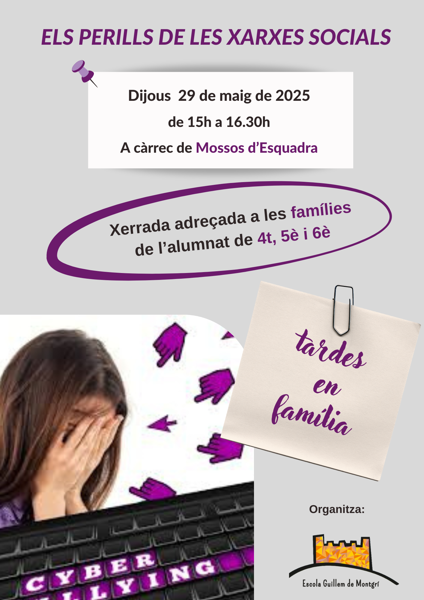 En la trobada de “Tardes en Família” d’aquest trimestre parlarem d’un tema tan real, actual i complex com l’assetjament escolar amb la col·laboració de l’Helena Tolosa, mestra, logopeda, psicopedagoga i assessora familiar i de  l’equip impulsor de convivència de l’escola Guillem. Cliqueu la imatge per consultar tot el contingut de la sessió