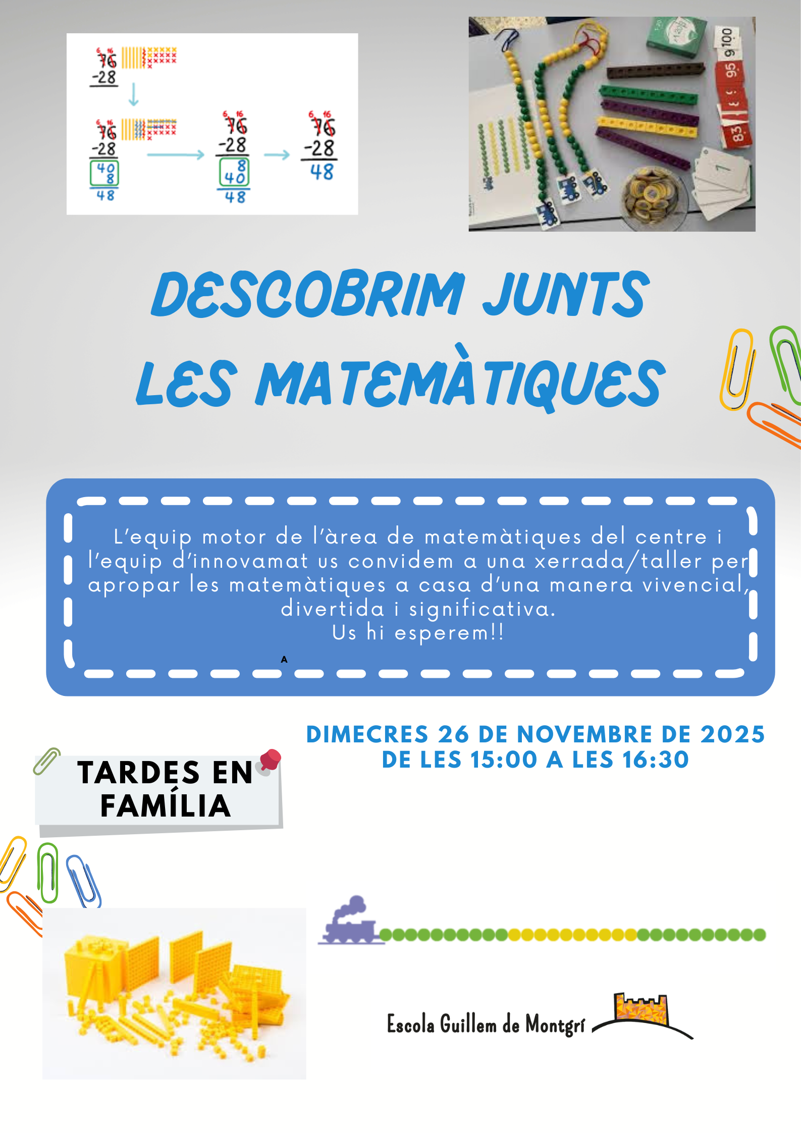 Xerrada-taller dedicada a l’aprenentatge de les matemàtiques a primària, amb activitats i exemples pràctics per conèixer millor com treballem les matemàtiques a l’escola i com podeu acompanyar els vostres fills i filles en aquest procés.