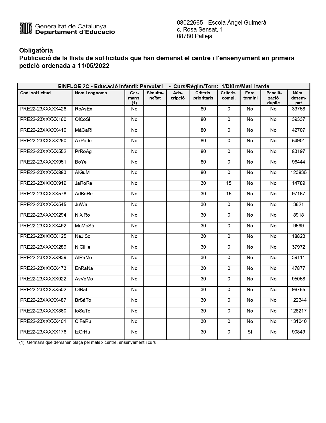 Publicació de la llista de sol·licituds que han demanat el centre i l’ensenyament en primera petició ordenada a 11/05/2022 Feu un comentari / Per admin / 11 de maig de 2022 / General