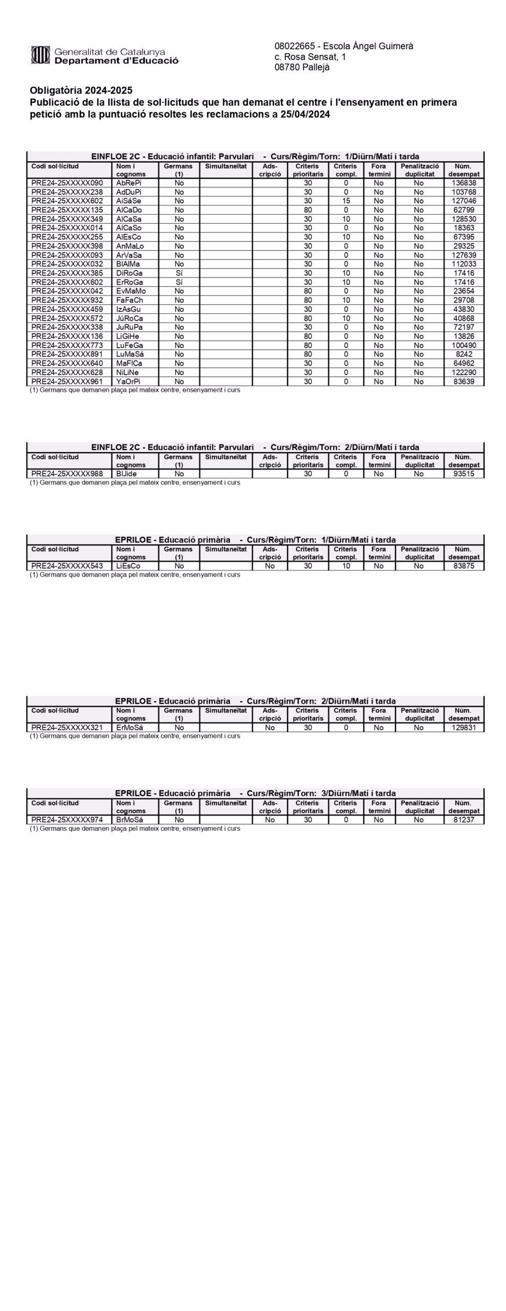 Sol·licituds que han demanat el centre i l’ensenyament en primera petició amb la puntuació resoltes les reclamacions a 25/04/2024