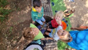 Després d’esmorzar vam fer una petita excursió pel bosc fins arribar a les vinyes. Allà vam aprendre a collir el raïm i vam observar el que era el cep, el pàmpol o la soca. Un cop vam tenir  el nostre cistell ple de gotims de raïm, vam tornar a la casa per aixafar-lo amb els nostres peus i poder extreure tot el suc. Aquest suc de raïm el vam poder tastar en els porrons que ens havien preparat els monitors.