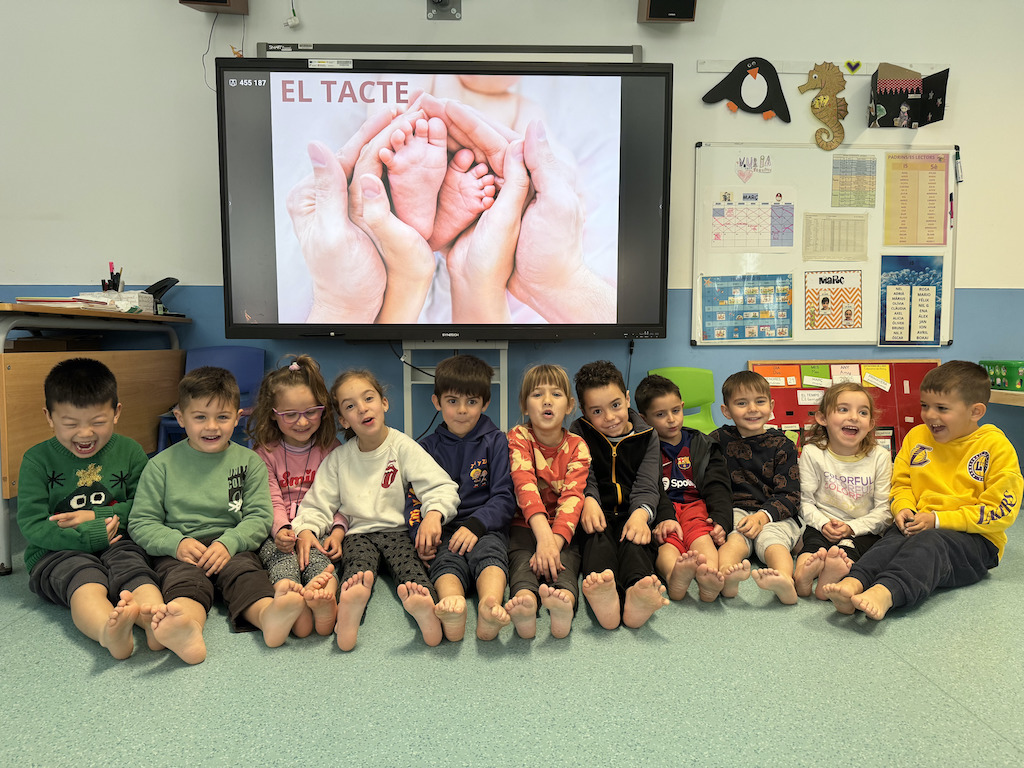 El tacte ha estat un dels sentits que hem explorat d’una manera més divertida. No només hem tocat textures de tota mena, des de les més suaus fins a les més rugoses, sinó que també hem experimentat amb els peus! Hem caminat descalces i descalços sobre diferents superfícies i hem rigut molt mentre descobríem noves sensacions. També ens hem fet massatges i pessigolles entre nosaltres, compartint moments de complicitat i benestar a través del contacte.