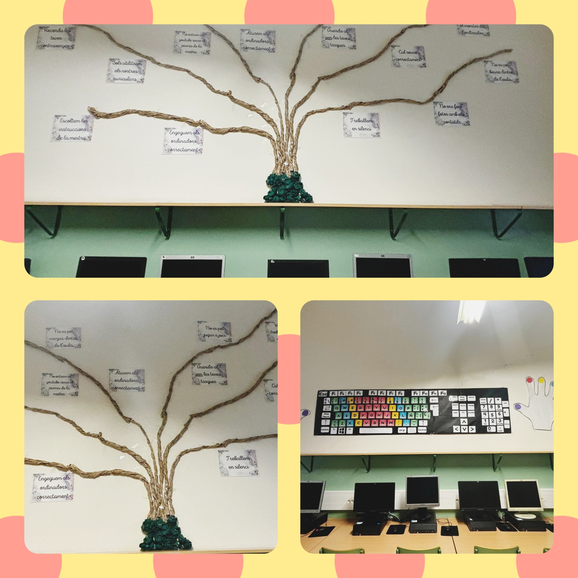 La nostra escola compta amb dues aules d’informàtica per tal de treballar les TAC. Els alumnes, d’I4 a 6è hi van amb mig grup i es treballen les competències específiques transversals que es van acordar a nivell de claustre, d’acord amb el nou currículum. Un cop acabat el primer trimestre, i amb els alumnes familiaritzats amb l’aula, les mestres que hi anem amb els diferents grups hem vist la necessitat de fer d’aquestes dues aules un indret acollidor i molt funcional. Els grans teclats, tan visuals i útils i els arbres de les normes, donaran vida a les dues aules. En voleu veure un tastet? Aquí us deixem un exemple gràfic de com donar esperit a unes aules plenes de “màquines”!
