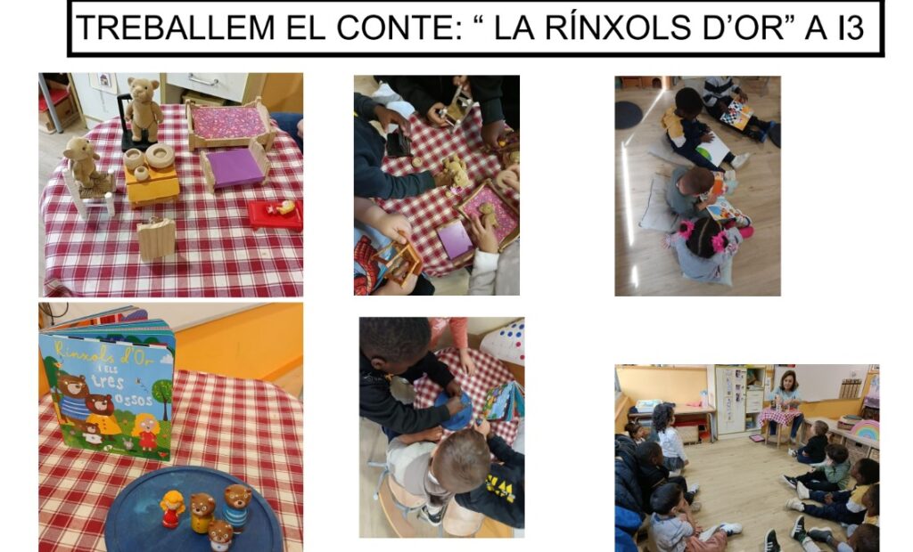 Primer hem escoltat i explicat el conte entre tots/es, observant les imatges i recordant què passava a cada moment de la història. A través del relat hem parlat dels personatges, dels diferents espais i de les accions que fa la Rínxols d’Or quan entra a la casa dels ossos.