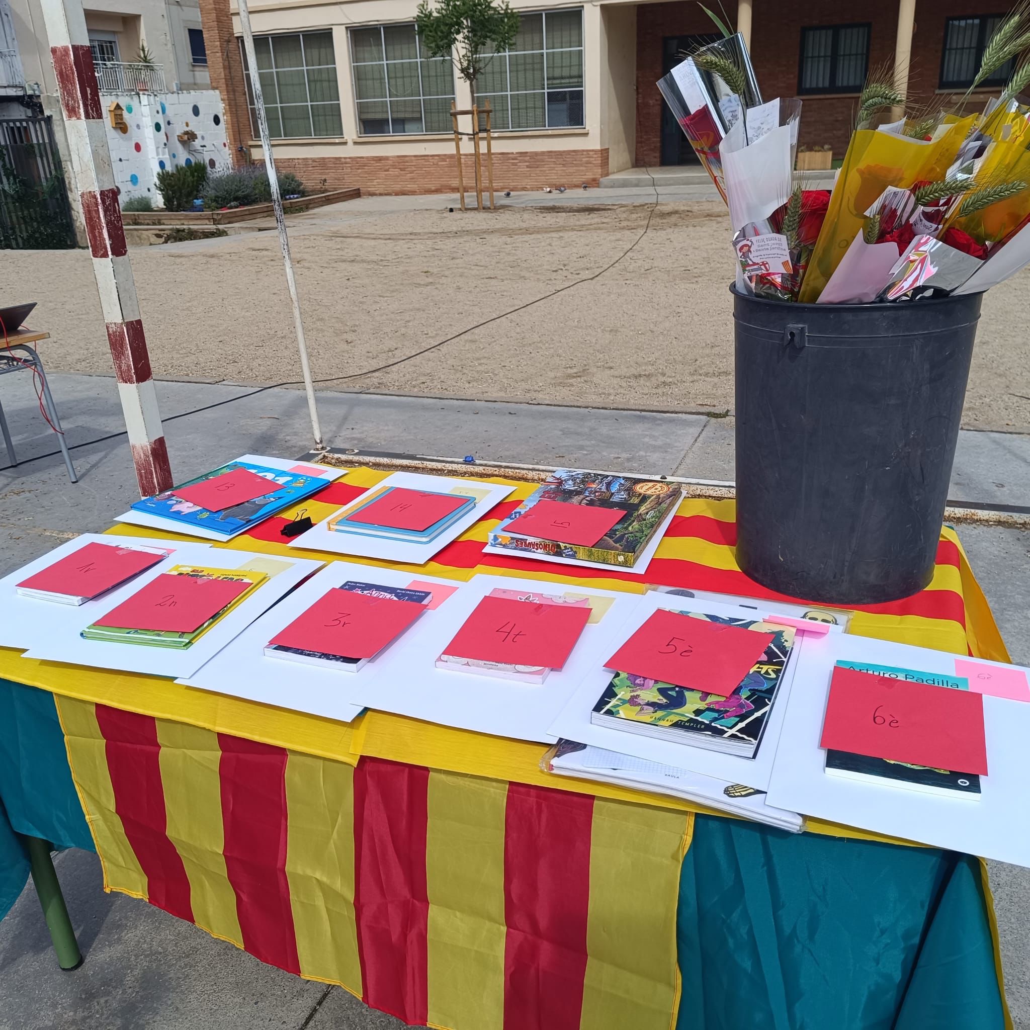 El 23 d’abril vam celebrar la diada de Sant Jordi al pati de l’escola. La Farah i el Lassana, dos alumnes de 5è, van fer de presentadors. Van ser els encarregats de conduir la celebració i d’anunciar els guanyadors dels diversos cursos.