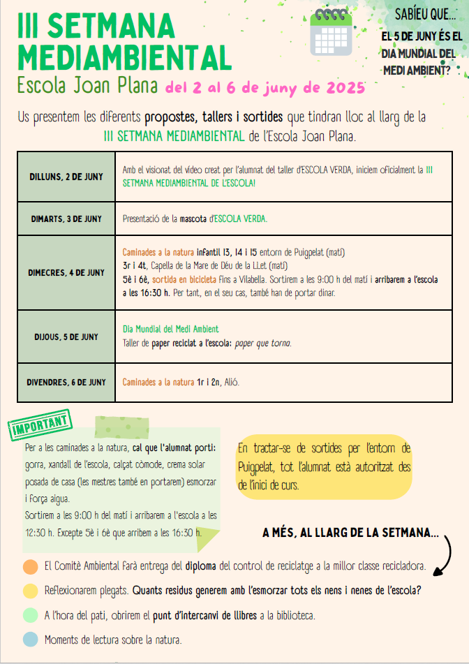06/06/25Durant la III Setmana Mediambiental, l’alumnat d’Educació Infantil i Primària ha participat en diverses sortides i activitats a l’entorn natural del nostre municipi i rodalies, amb l’objectiu de fomentar el respecte pel medi ambient i el coneixement del nostre entorn més proper. Aquesta setmana ha estat una gran oportunitat per aprendre fora de l’aula i per viure experiències significatives en contacte amb la natura. Continuem treballant plegats per estimar i protegir el nostre planeta!