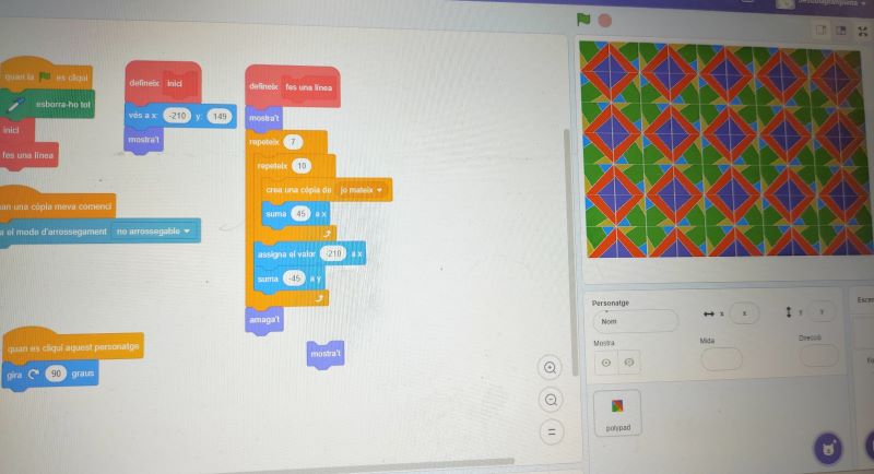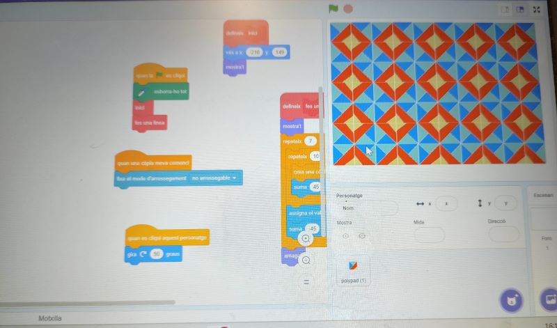 12/01/26Aquest curs els alumnes de 5è de la nostra escola participen en el PCMAT (Programa temporal mentories) destinat a millorar la competència matemàtica a través del pensament computacional, la programació i la robòtica educativa. Al llarg del primer trimestre, van desenvolupar la primera tasca que tenia com a objectiu dissenyar un mosaic amb patrons geomètrics a través del programa informàtic Scratch.
