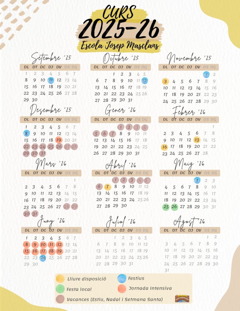 - Nadal: del 22 de desembre de 2025 al 7 de gener de 2026 (ambdós inclosos).