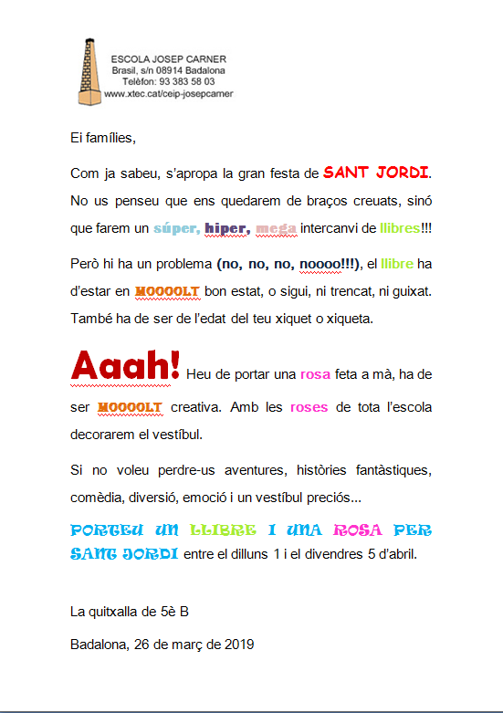 Enguany hem demanat a les nenes i els nens de 5è que redactin el comunicat de l’intercanvi de llibres del dia de Sant Jordi.