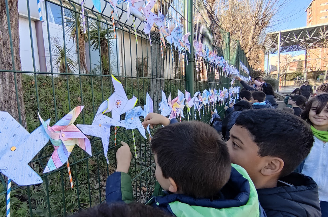 També hem volgut omplir l’escola de colors i esperança: els padrins i fillols han decorat la reixa del centre amb molinets de vent, cadascun amb dibuixos i missatges de pau, convertint-la en un símbol de convivència i solidaritat.