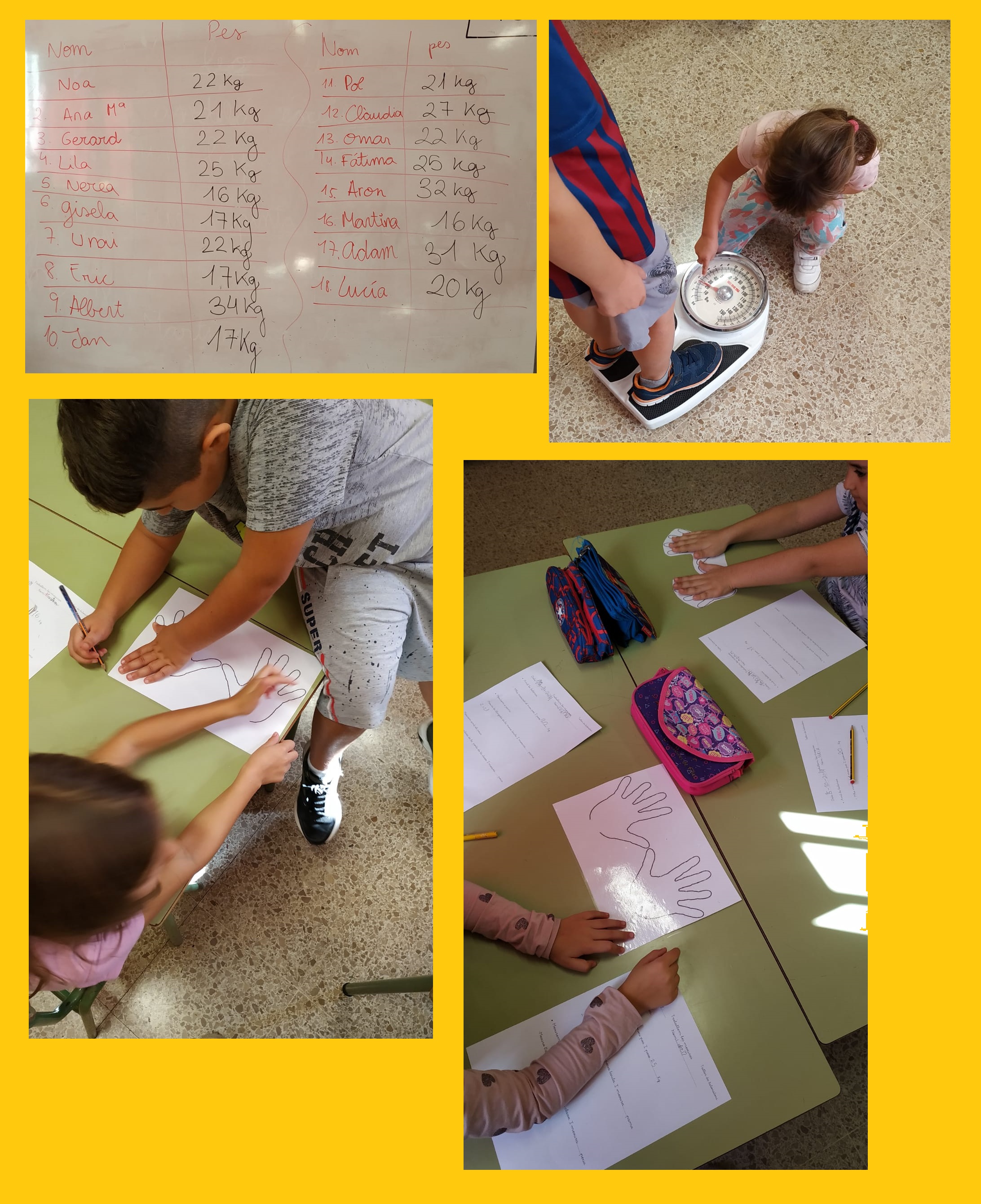 Les primeres activitats que hem fet estan relacionades amb els conceptes de Mesura i Pes. Hem experimentat mitjançant mesures no convencionals, utilitzant les mides de les nostres mans i hem fet comparacions relatives al pes dels companys i companyes de classe.