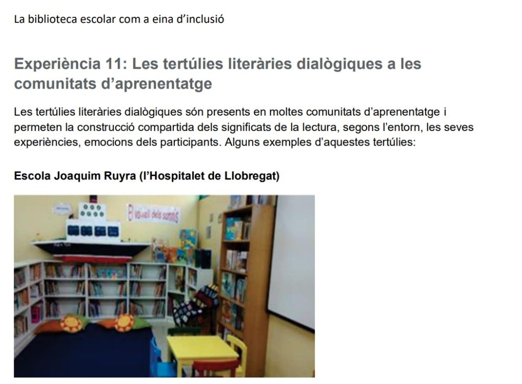 Tenim el plaer de comunicar-vos que, des del Programa biblioteca escolar Puntedu, han publicat el document La biblioteca escolar com a eina d’inclusió, en el qual fan referencia al nostre centre per les seves bones pràctiques i més en concret per les Tertúlies Literàries Dialògiques.
