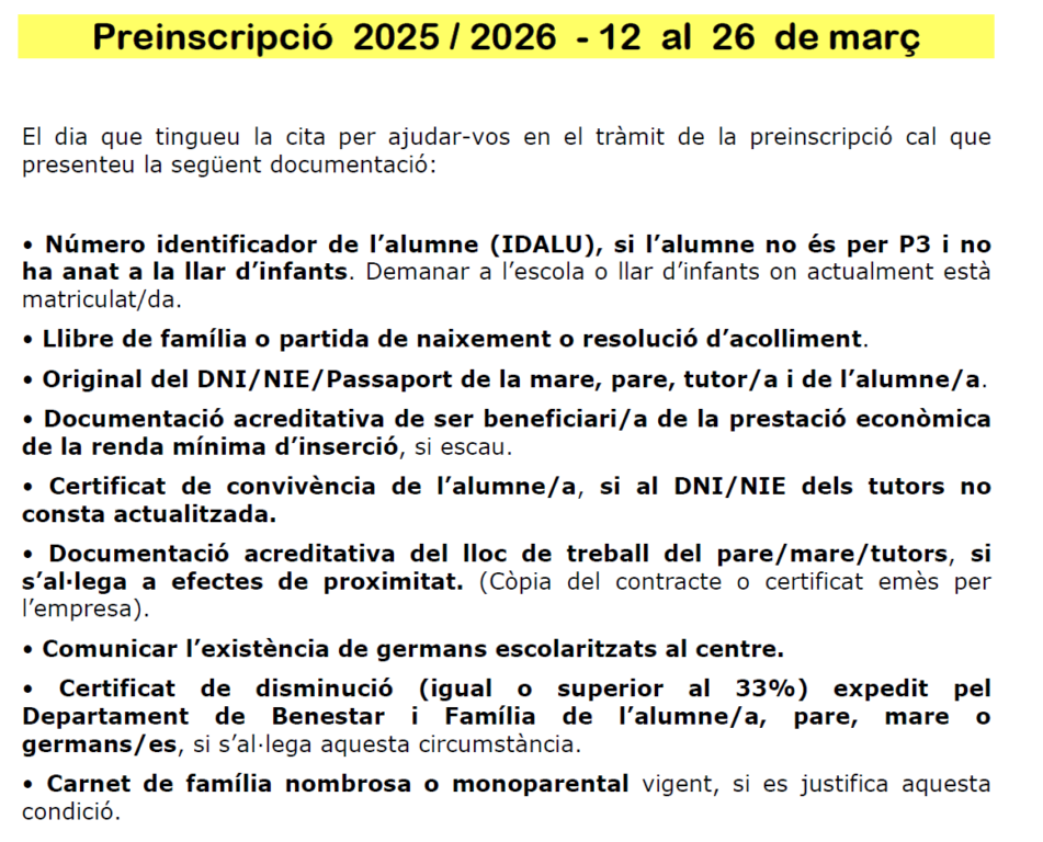En el cas que necessiteu ajuda per dur a terme qualsevol de les dues modalitats de sol·licitud de preinscripció, citades anteriorment, l’escola ofereix un acompanyament a les famílies al moment de realitzar aquests tràmits. Es durà a terme mitjançant cita prèvia trucant per telèfon a l’escola (934406344)