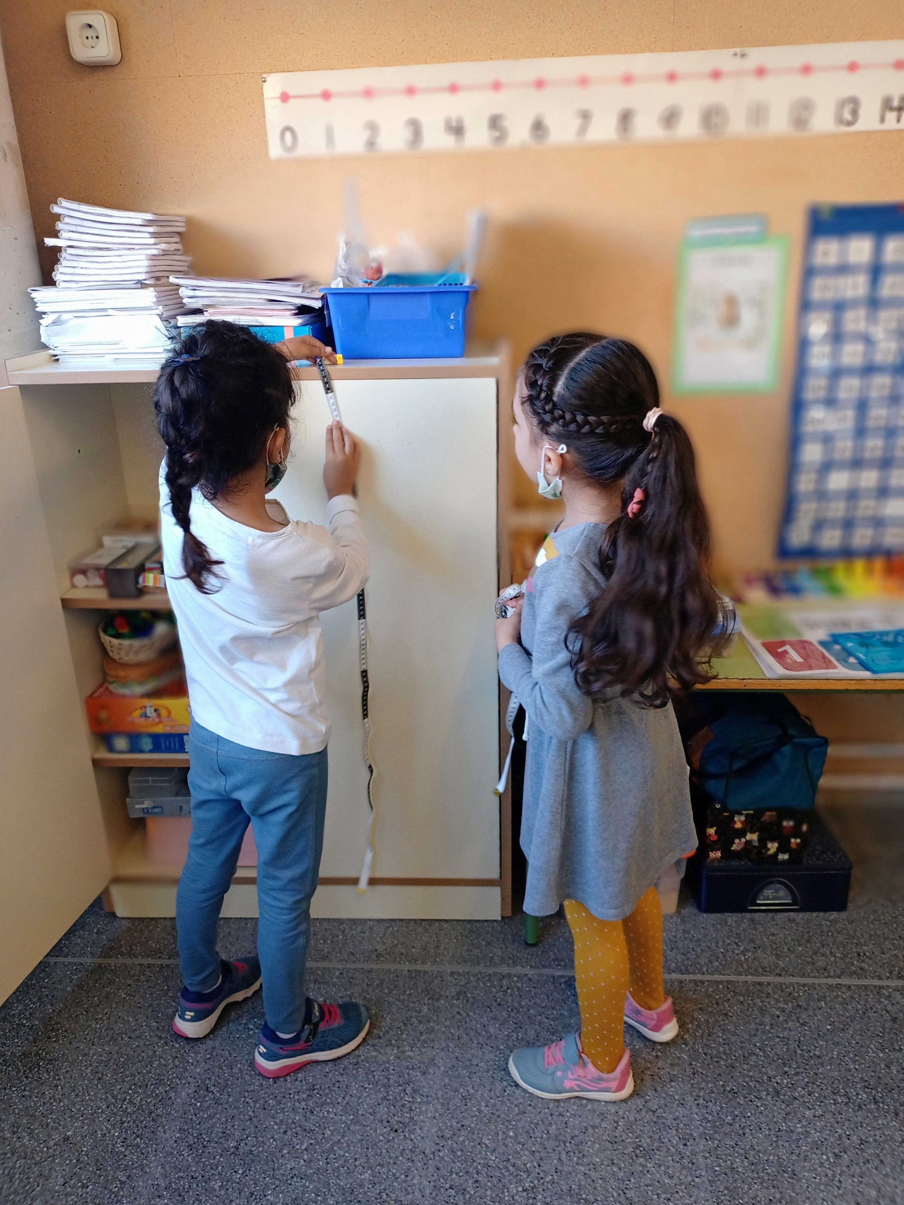 Com volíem saber mesurar més, l’Aisha ens ha donat un metre a cada nen i nena i hem començat a medir coses de la classe.