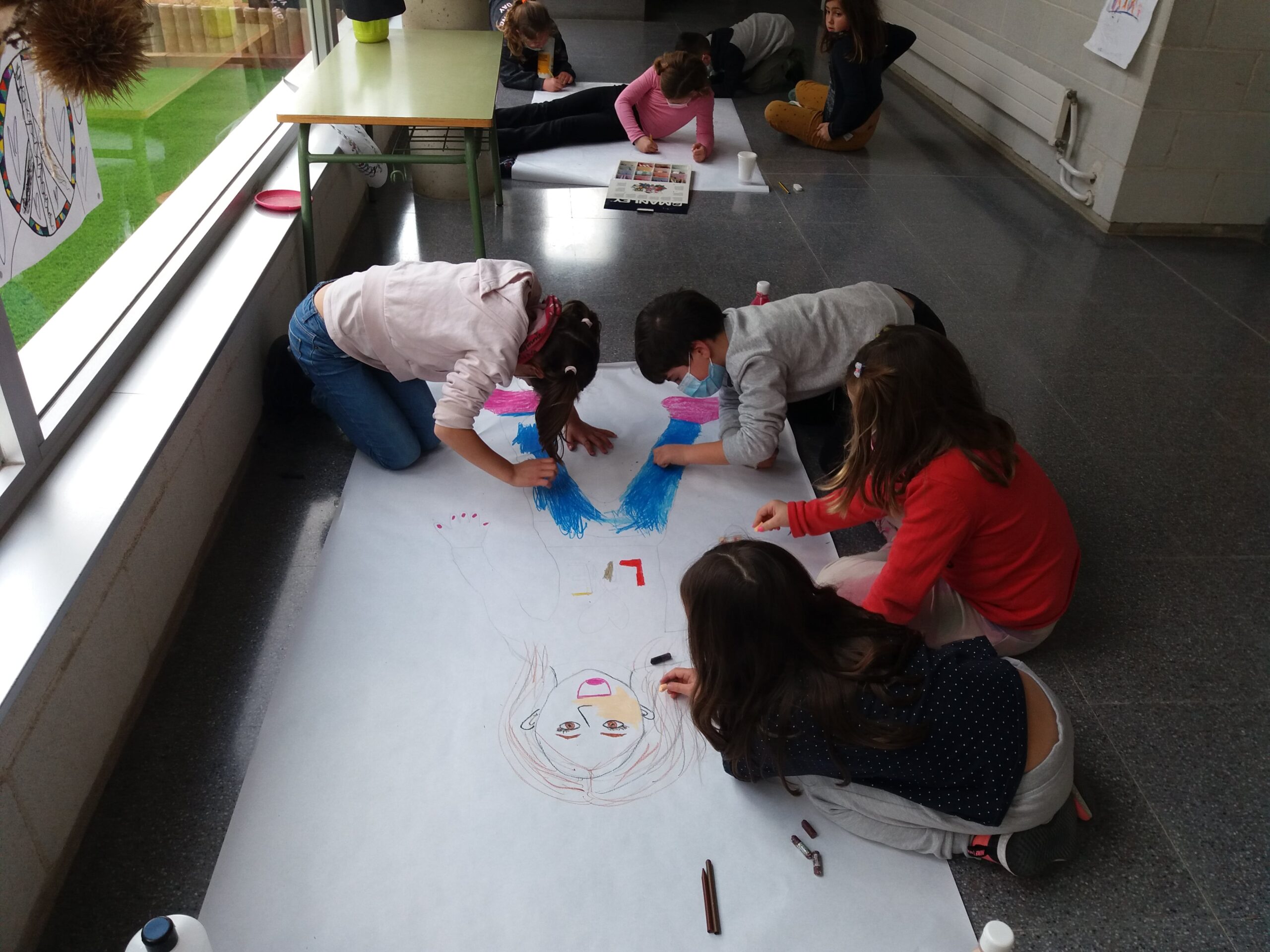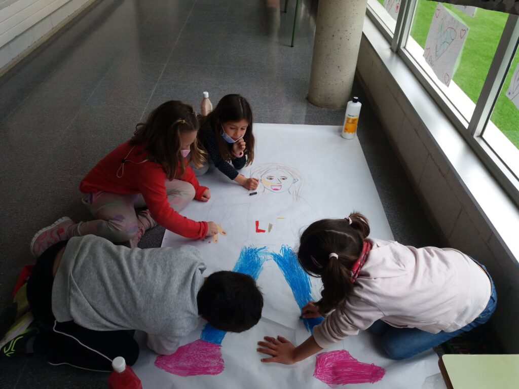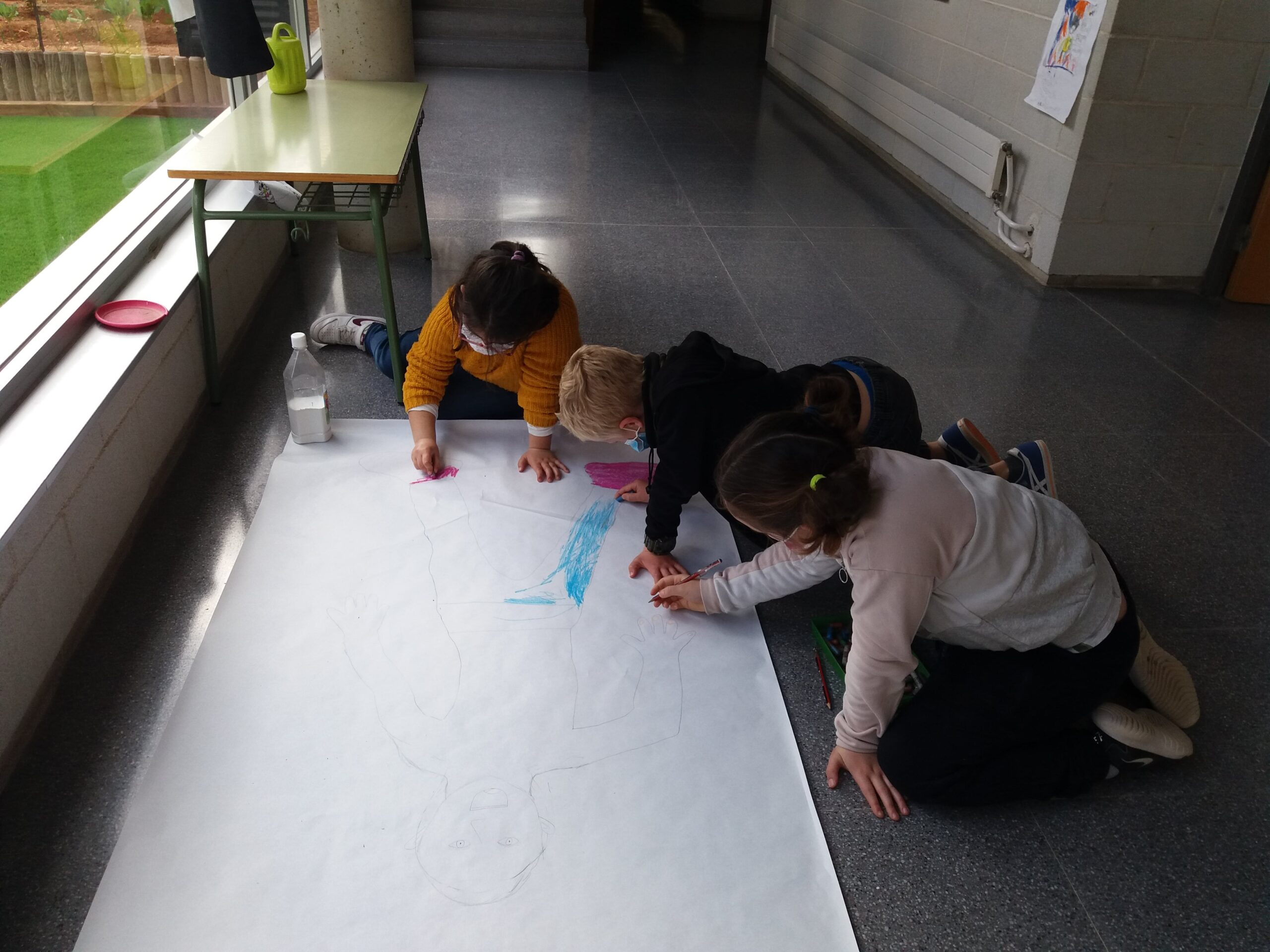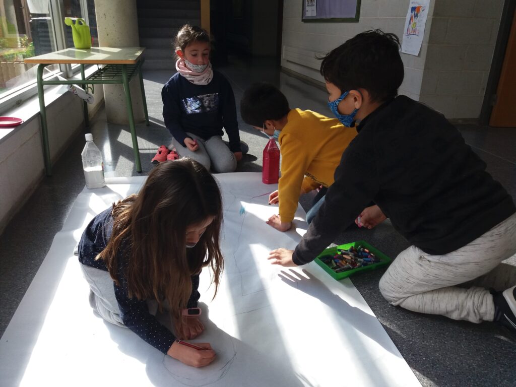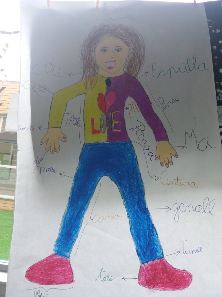En una sessió de Plàstica la Sandra va resseguir la silueta d’una companya per després poder-la pintar de colors. A la hora de Medi, van posar els noms de les parts del cos.