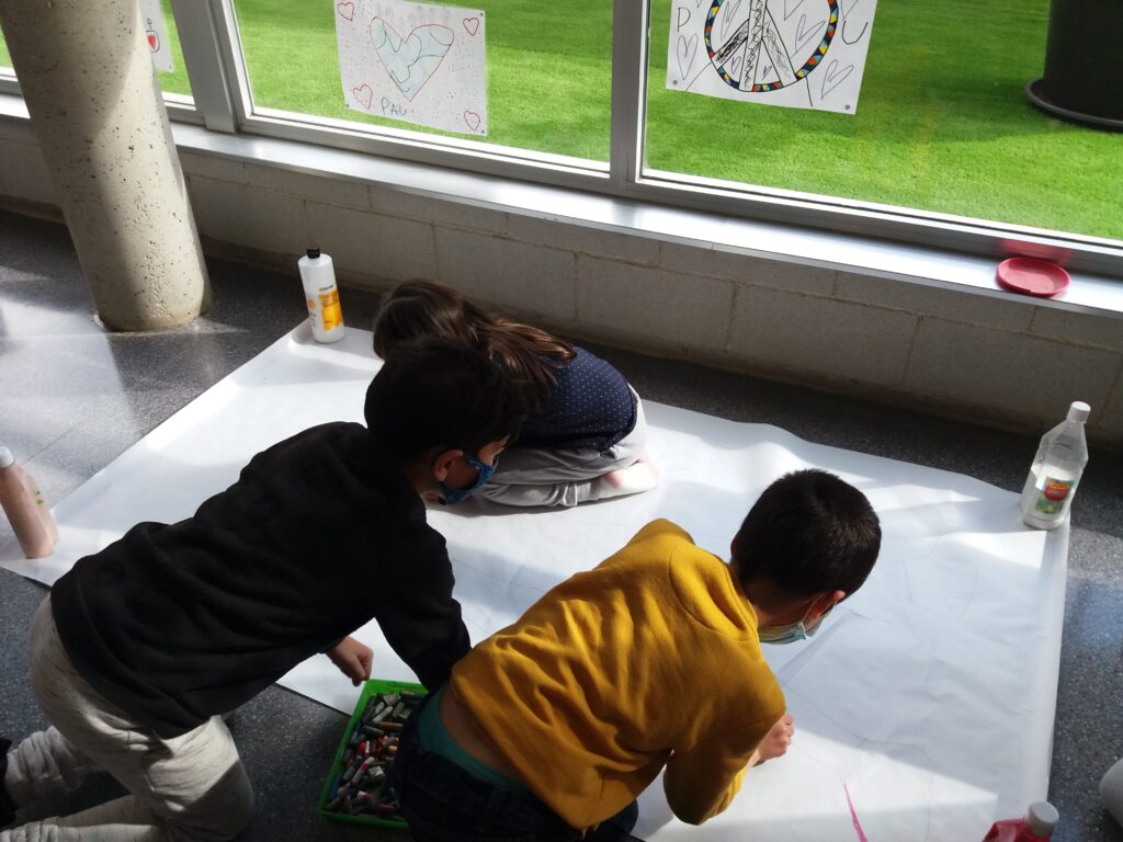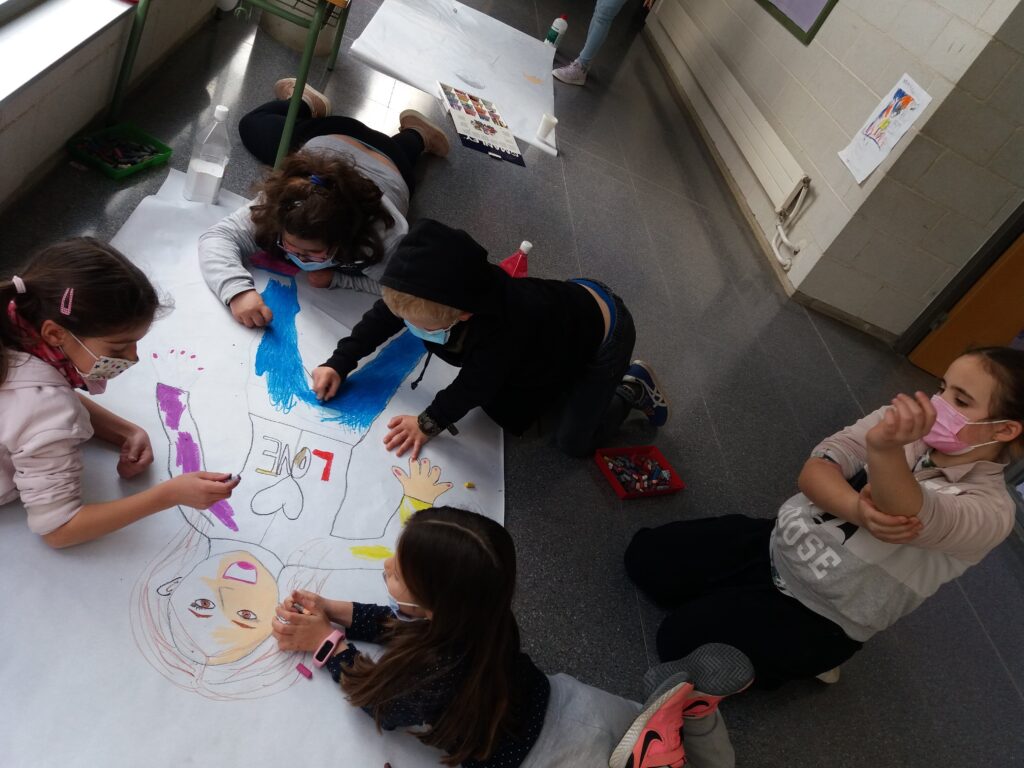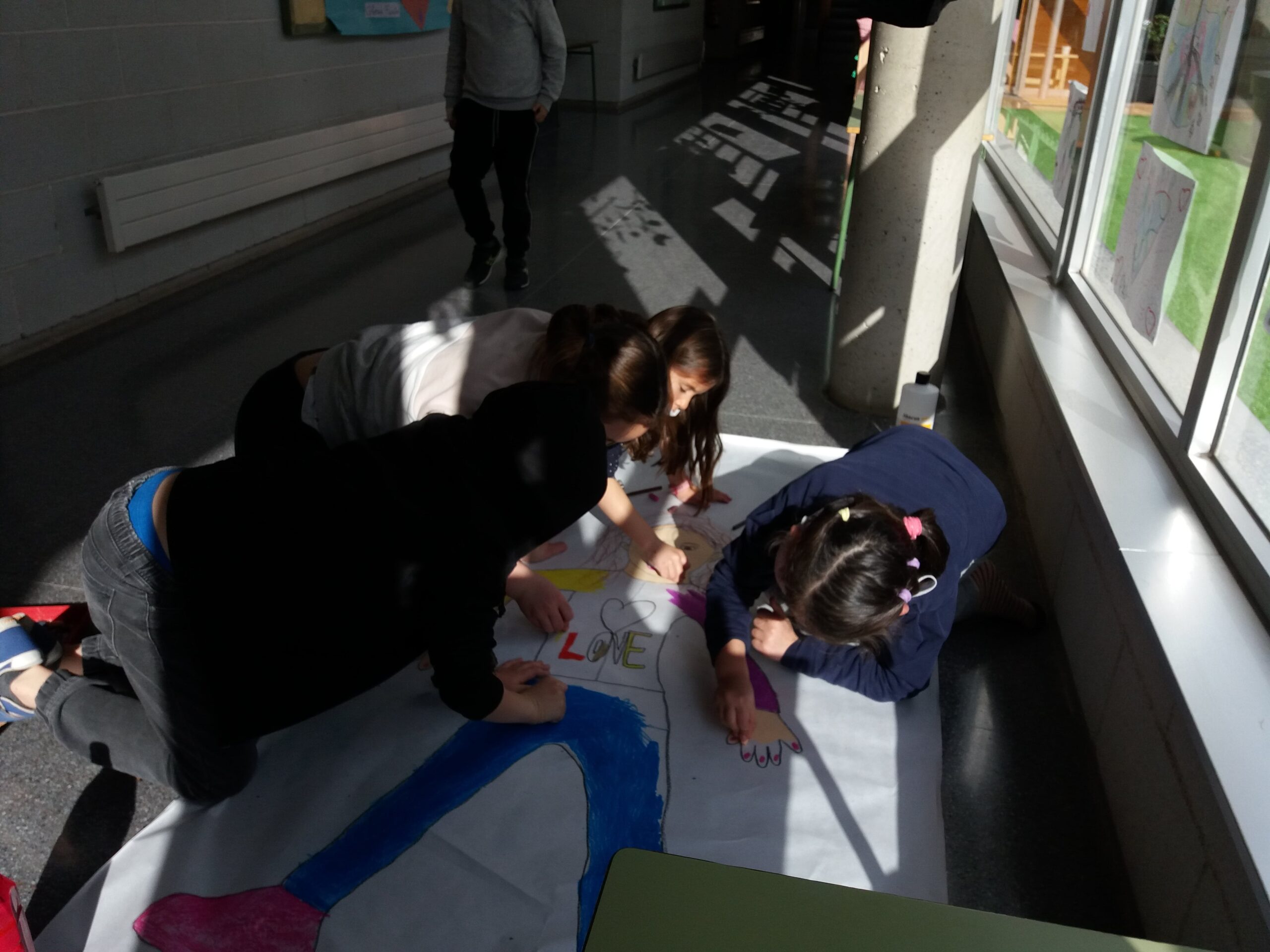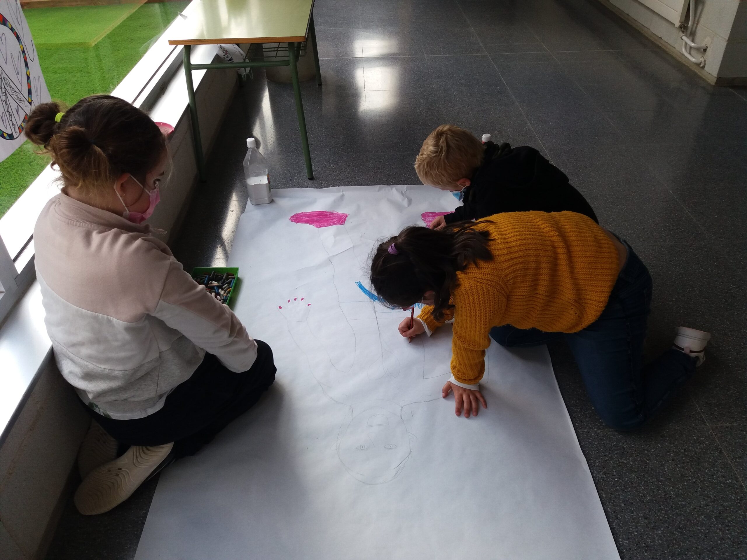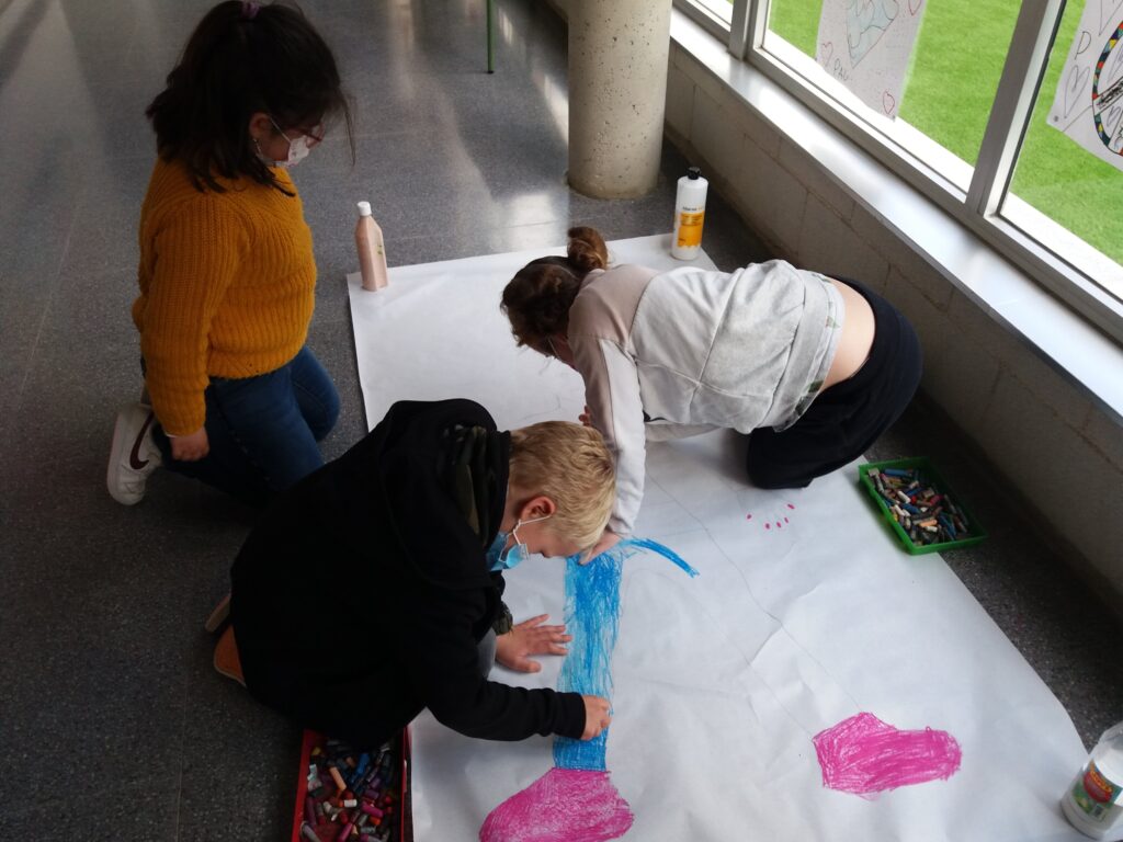 En una sessió de Plàstica la Sandra va resseguir la silueta d’una companya per després poder-la pintar de colors. A la hora de Medi, van posar els noms de les parts del cos.