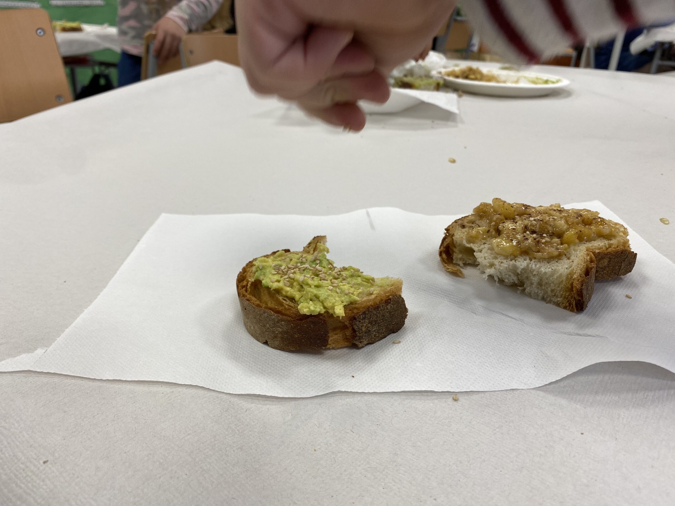 La primera recepta és una llesca de pa amb melmelada de plàtan i cacau en pols i la segona recepta és una llesca de pa amb alvocat i unes llavors de sèsam.![]()
