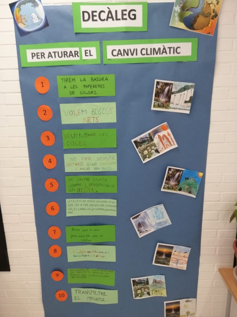 Per tal de crear consciència col·lectiva hem preparat un decàleg amb tot de mesures per millorar el medi ambient i el nostre entorn, que podeu trobar a l’entrada de l’escola, conjuntament amb tot de desitjos que tenim repartits pel centre escolar, encarats a millorar el nostre futur.