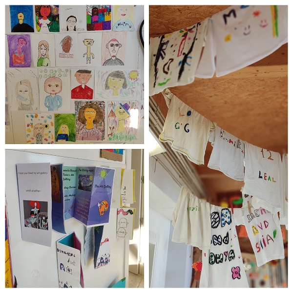Aquí podeu veure alguns dels productes finals que han elaborat els nens i nenes: uns pamflets per una galeria d’art, unes samarretes dissenyades en base a l’obra de l’artista Sonia Delanuy i uns retrats seguint l’estil de pintors i pintores famosos.