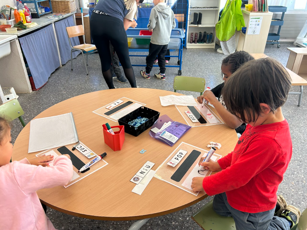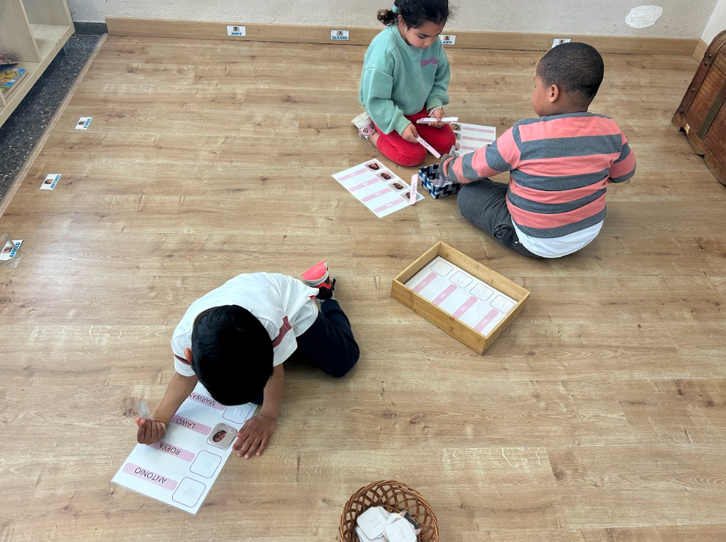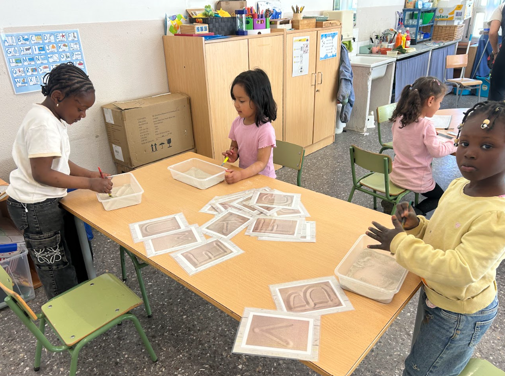 A I4 ens iniciem en la lectoescriptura a través de diversos jocs de llengua en petits grups dins de l’aula. Ho fem a partir de propostes per treballar la motricitat fina, el traç, la composició de paraules, la consciència fonològica i el reconeixement del nom dels companys de classe.