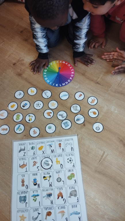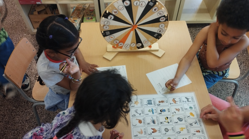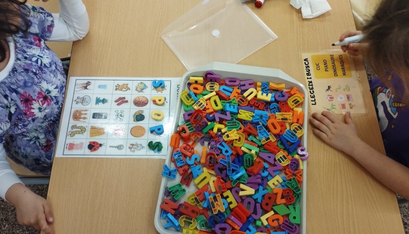 A I5 a jocs de llengua, estem treballant els sons inicials, també estem aprenent a confegir paraules, lectura de monosíl·labs, escriptura de paraules boniques, pots de lectura… A  través del joc i la manipulació, potenciem i fem possible l’aprenentatge significatiu de la llengua.