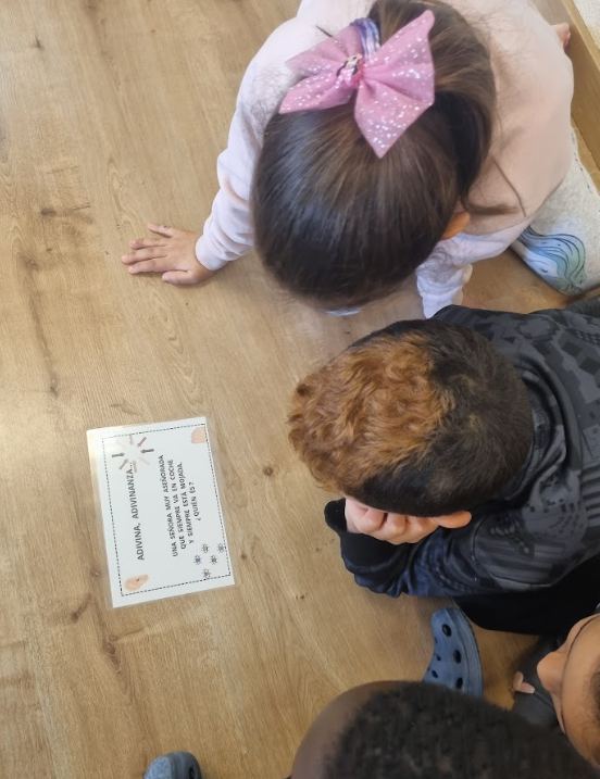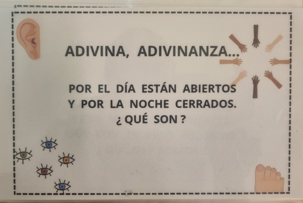 Hem realitzat una activitat d’endevinalles centrada en el camp semàntic de les parts del cos. L’alumnat ha llegit diferents endevinalles i, a partir de les pistes que apareixen al text, havia d’identificar la part del cos corresponent. Amb aquesta activitat s’ha treballat la comprensió lectora, la interpretació de pistes i l’ampliació i consolidació del vocabulari relacionat amb les parts del cos, fomentant també la participació i el raonament.