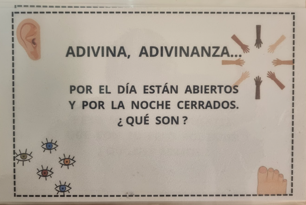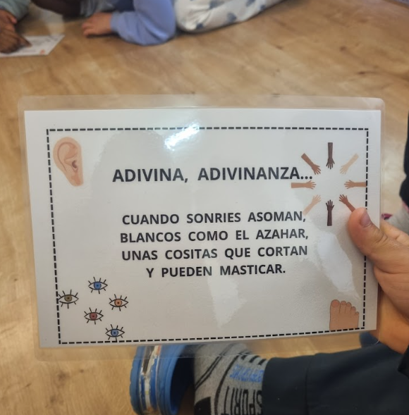 Hemos realizado una actividad de adivinanzas centrada en el campo semántico de las partes del cuerpo. El alumnado ha leído diferentes adivinanzas y, a partir de las pistas que aparecían en el texto, debía identificar la parte del cuerpo correspondiente. Con esta actividad se ha trabajado la comprensión lectora, la interpretación de pistas y la ampliación y consolidación del vocabulario relacionado con el cuerpo humano, fomentando además la participación y el razonamiento.