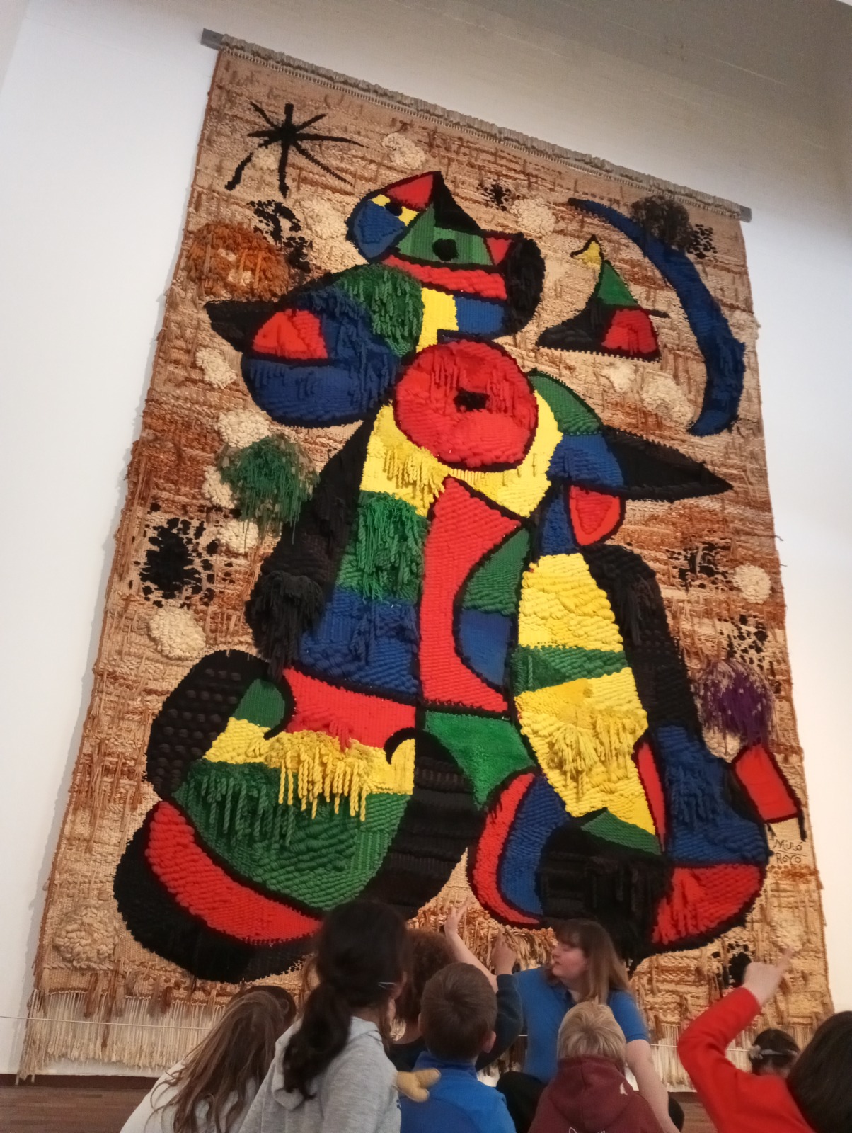 Al llarg del recorregut per les sales del museu, vam aprendre a mirar l’art amb ulls nous: Miró transformava objectes quotidians en escultures, pintures i fins i tot tapissos plens de significat. Ens va cridar molt l’atenció com representava les persones amb formes geomètriques, i que sempre dibuixava tres cabells! També vam descobrir que sovint s’inspirava en els seus somnis, i que li encantava representar elements del cel, com el sol vermell, la lluna blava, els planetes com punts de colors i les estrelles de cinc puntes o estels formats per quatre ratlles.