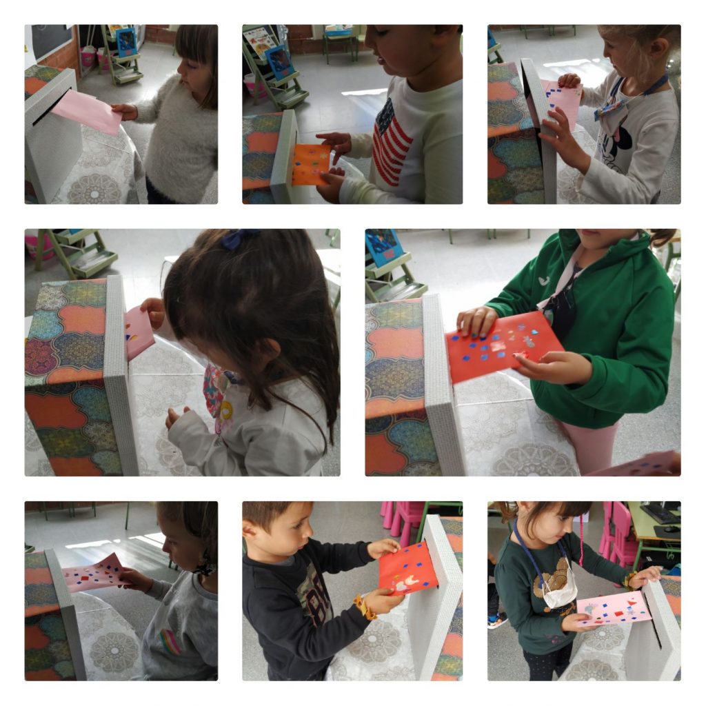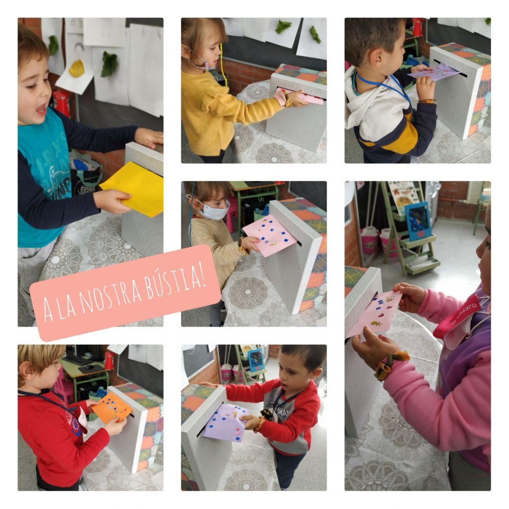 El conte que va portar el Gerard ens ha motivat a fer les nostres cartes, aquesta vegada l’hem fet amb un activitat guiada, per saber com fer servir la bústia de la classe. Hem decidit que la bústia es queda a l’aula per si algú vol escriure o fer una nota lliurement i al final de la setmana obrir-la per repartir el correu acumulat.