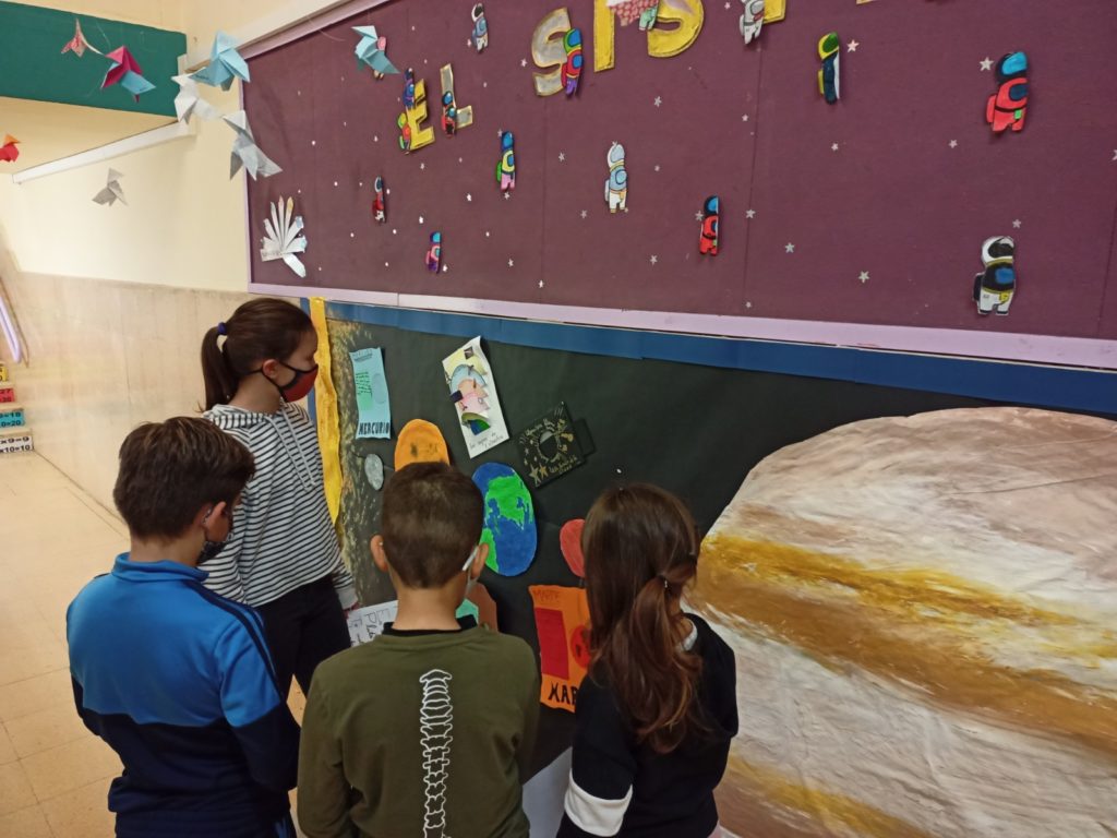 L’univers és el tema del projecte que el nostre alumnat de 4t està portant a terme durant aquest trimestre. Hem aprofitat una paret gegant del passadís per fer un mural gegant del Sistema Solar i afegir una petita mostra de tot el que estem treballant a l’aula. Podeu adreçar-vos a la icona de fotos i vídeos per veure les imatges que anem afegint sobre el procés de treball i creació d’aquest gran i bonic mural.