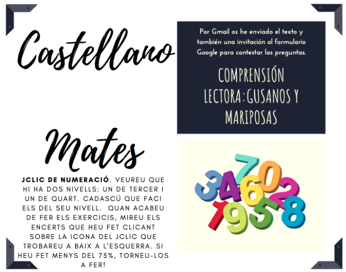 L’escola a casa-Divendres 8 de maig Feu un comentari / Per llopez23 / 7 de maig de 2020 / CM / Cicle Mitjà, escola a casa, joemquedoacasa 1.Hoy empezamos compartiendo dos de vuestras adivinanzas en castellano. ¿Os animáis a jugar? Les propostes d’avui són:
