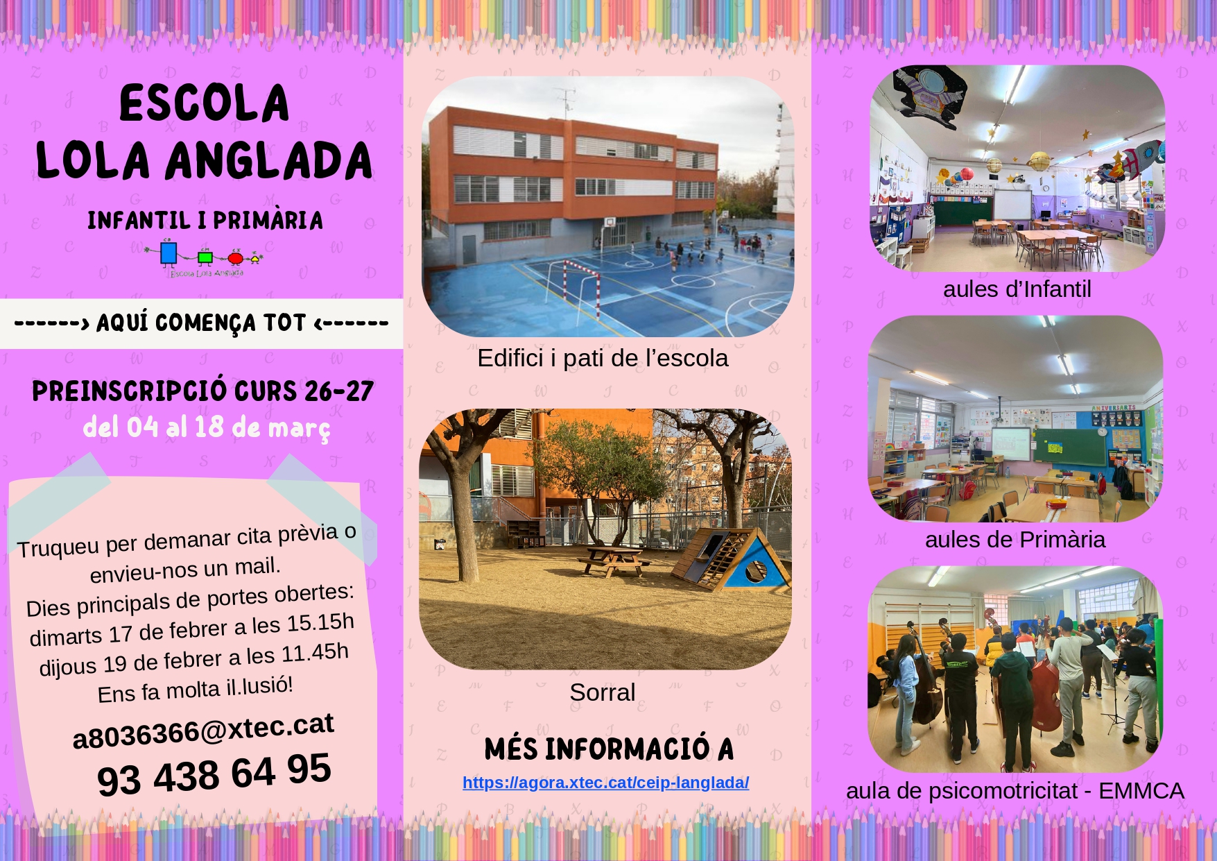 Farem Portes Obertes amb cita prèvia trucant-nos al telèfon 93 438 64 95 o enviant-nos un mail a a8036366@xtec.cat. Dies principals de les portes obertes el dimarts 17 de febrer a les 15.15h i el dijous 19 de febrer a les 11.45h.
