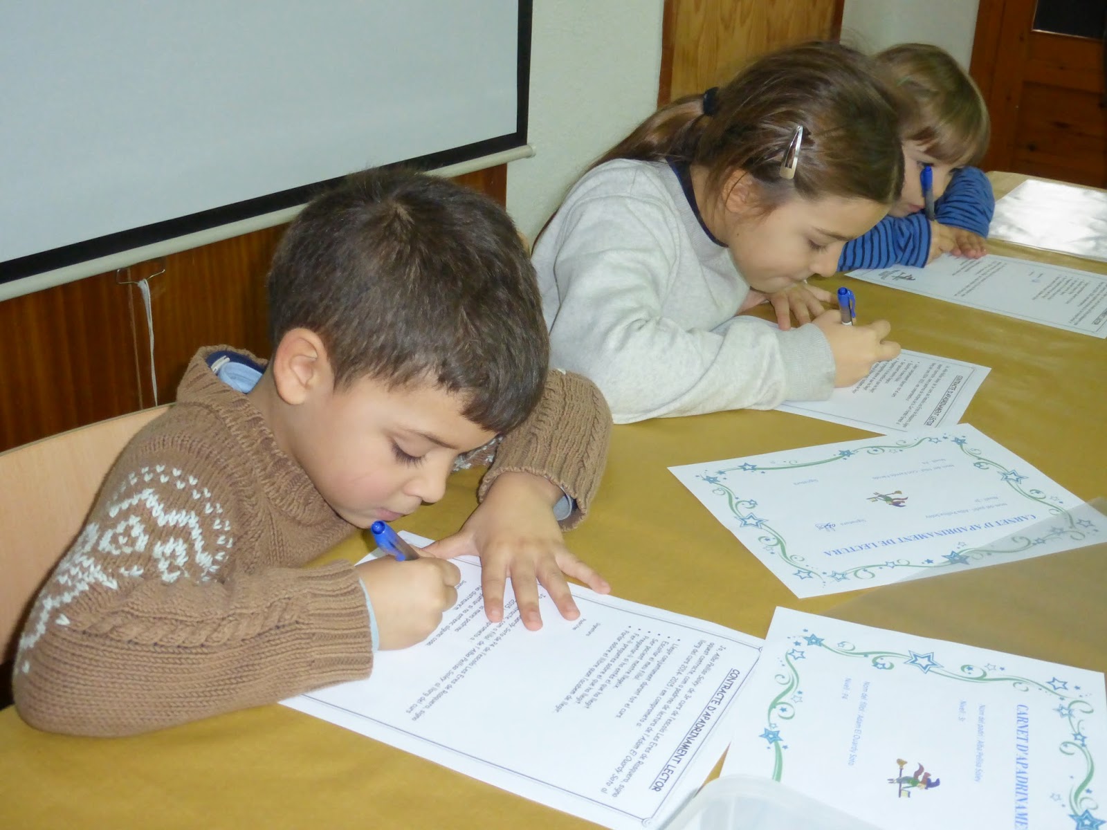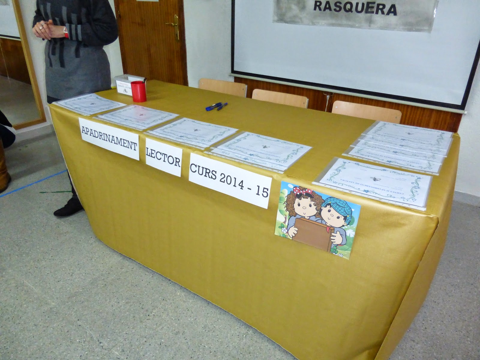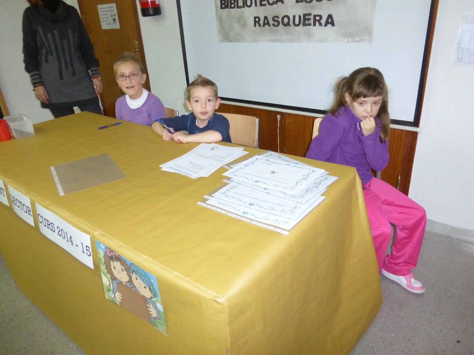 Aquest dia els alumnes de cicle mitjà,que són els padrins i els alumnes de P4 i P5 ,que són els fillols ,van signar un contracte en el que es comprometien uns i altres a compartir estones de lectura.