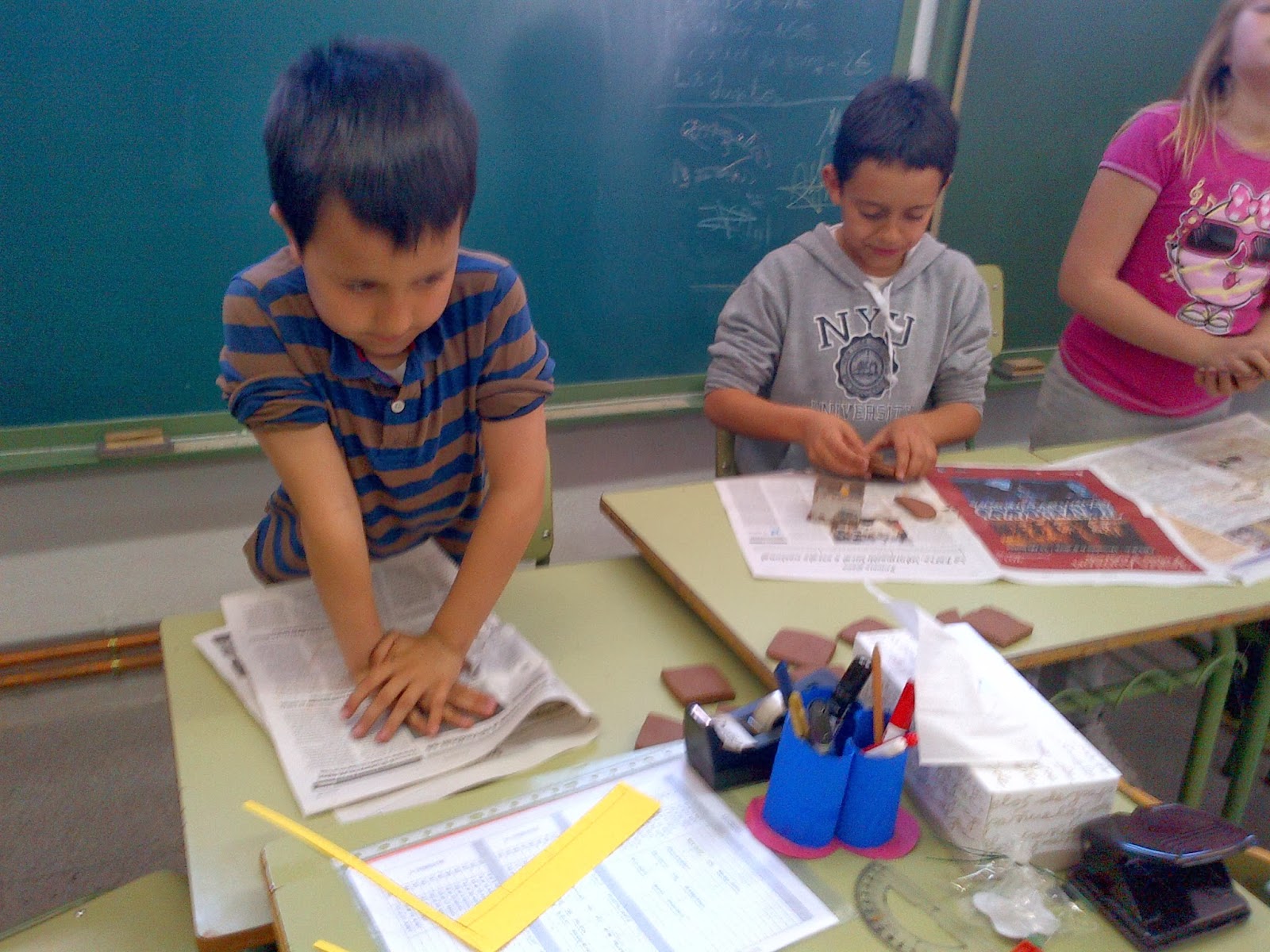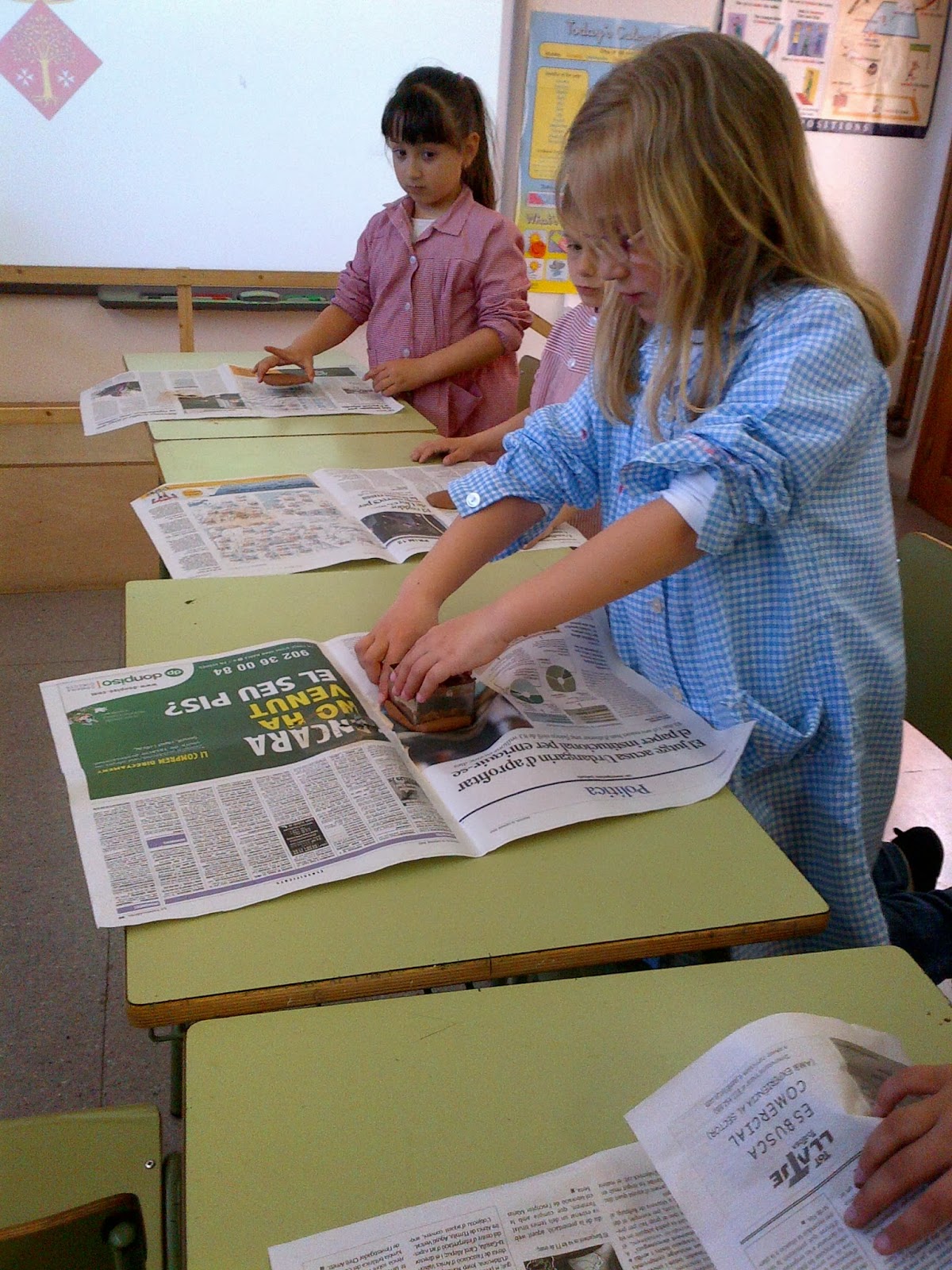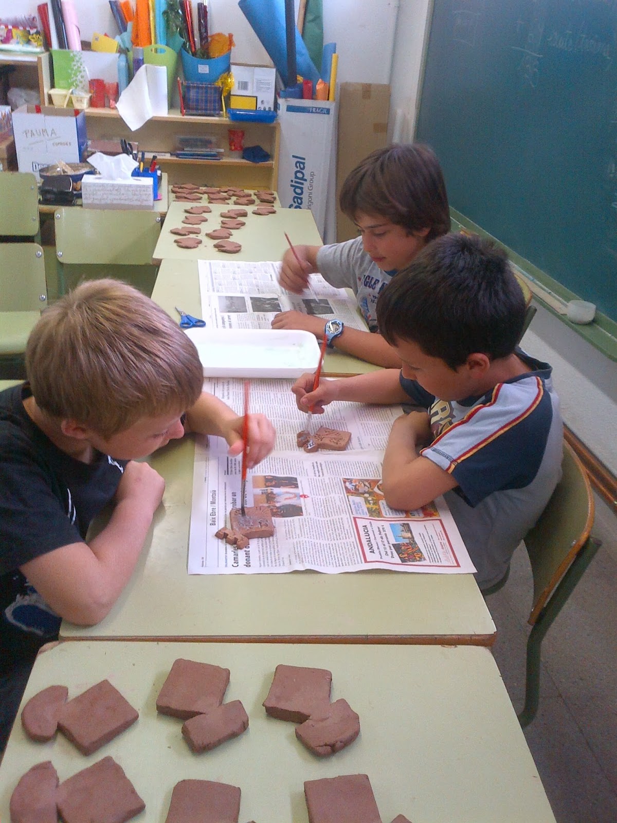 Els nens de CI i CM fent els escuts de fang de Rasquera.