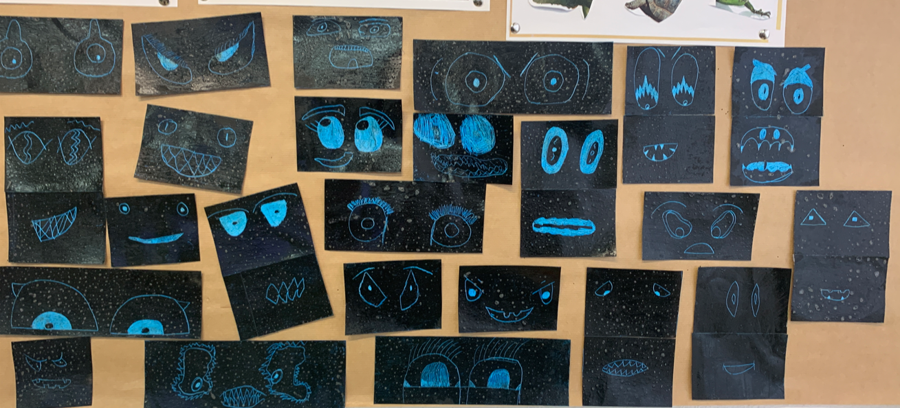 1. Immersió i Contextualització: Abans d’obrir el llibre, vam explorar la figura de l’autor, entenent el seu estil i l’univers de l’obra. Per connectar emocionalment amb la temàtica, vam utilitzar la tècnica artística de l’esgrafiat per dissenyar ulls de monstres, creant una atmosfera de misteri i curiositat a l’aula.