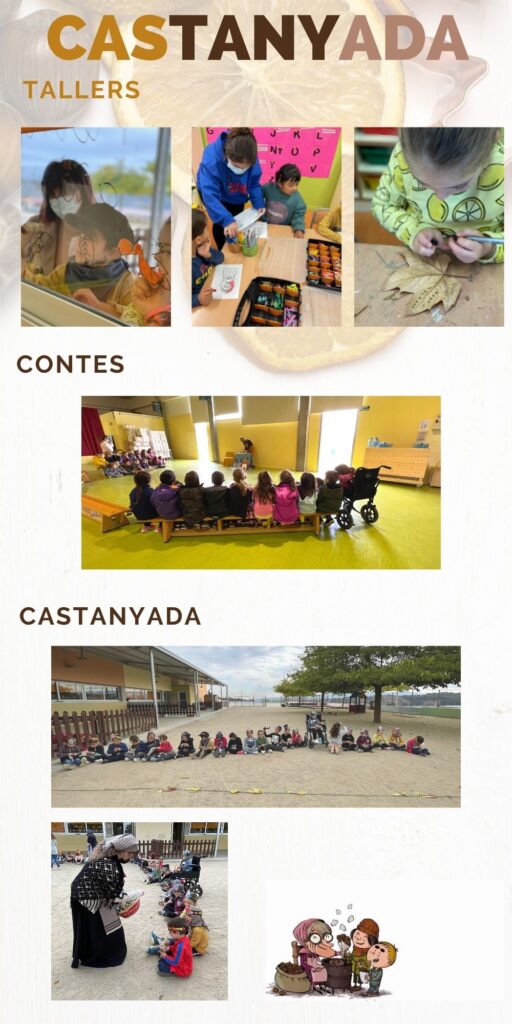 Aquest divendres els infants de P5, han celebrat la castanyada. Pel matí van fer diferents tallers amb l’ajuda i col·laboració de les famílies de la classe, van fer: decoració de les finestres de la classe, titella de la Castanyera, …