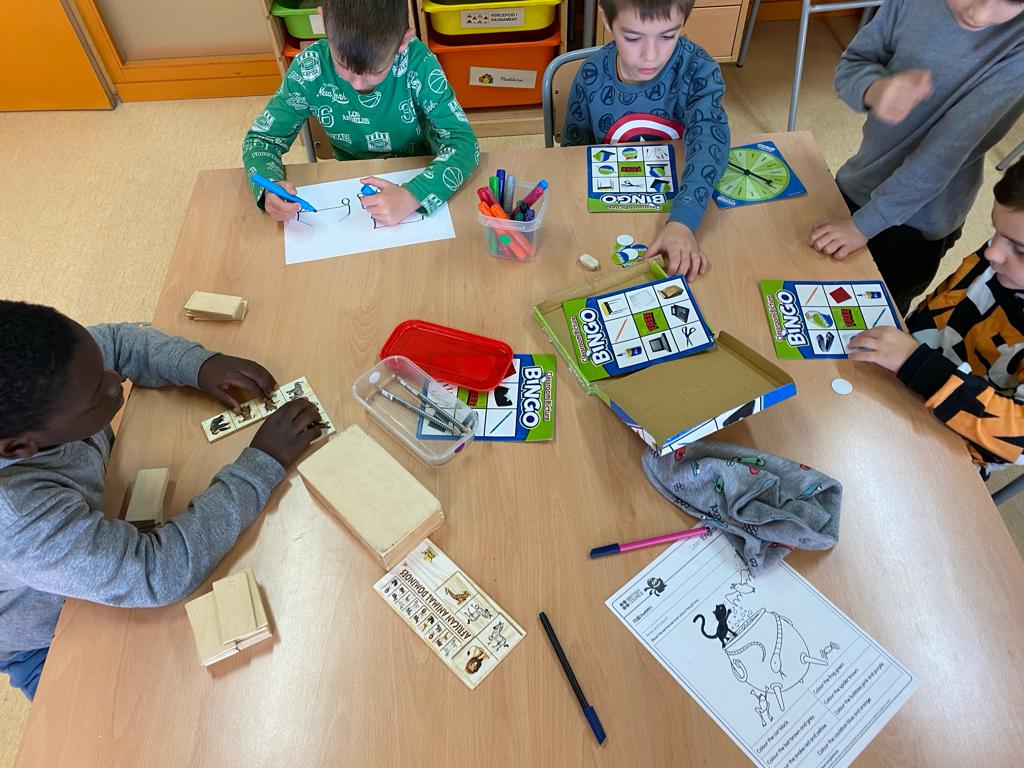 Ens hem agrupat per taules i hem fet English corners, que són els racons de tota la vida, però in English tot practicant els nostres speaking, reading and listening. Així doncs, alguns/es hem jugat al bingo, d’altres al dominó i els i les més artístics i artístiques, hem fet algunes de les activitats complementàries que tenim (fitxes per repassar vocabulary com colours, parts of the body, numbers, etc.).