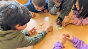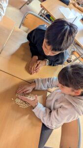 Poc a poc, aquesta relació de la fracció com a part d’un grup s’ha anat estenent i, els nens i nenes més grans, han començat a prendre consciència de com calcular la fracció d’un nombre gràcies a la pràctica a través de mongetes i del cercle de fraccions, on visualment, han entès perquè per a trobar la fracció d’un nombre cal primer dividir i, després, multiplicar.
