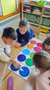 En els primers cursos de primària, hem iniciat el treball de fraccions a través de la manipulació de materials per a entendre el concepte de doble i meitat. A partir de 2n, l’ús del rellotge ha sigut essencial per a comprendre els quarts en relació al tot i, a la vegada, començar a relacionar les fraccions amb una quantitat numèrica en adonar-se que un quart d’hora equivalia a 15 minuts.