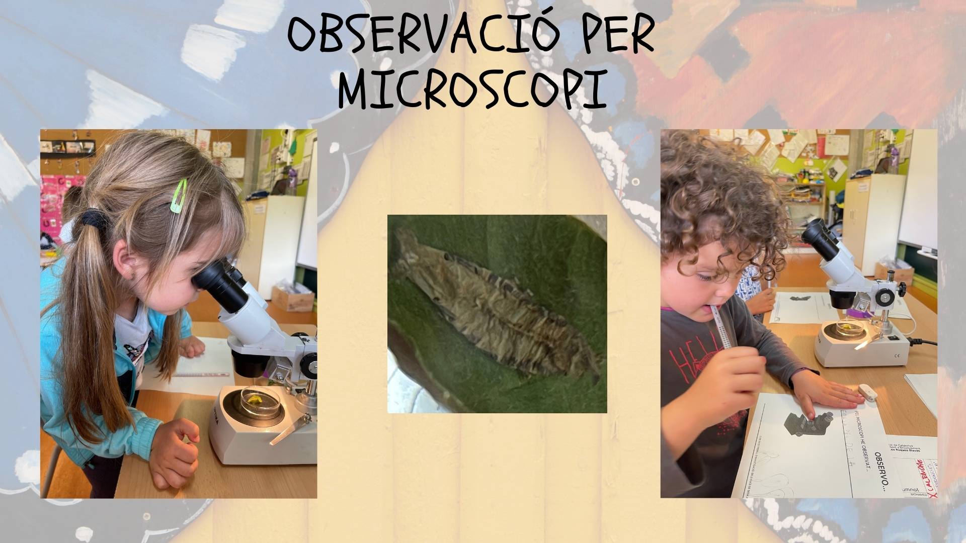 A més a més, durant la setmana passada, els infants van utilitzar el microscopi electric per veure de més a prop, la pell que van deixar els cucs de seda, i van escriure el que van observar.