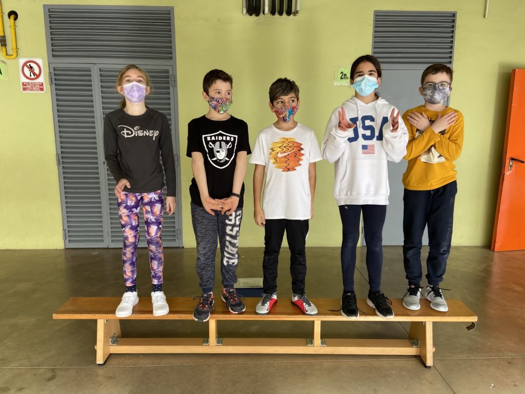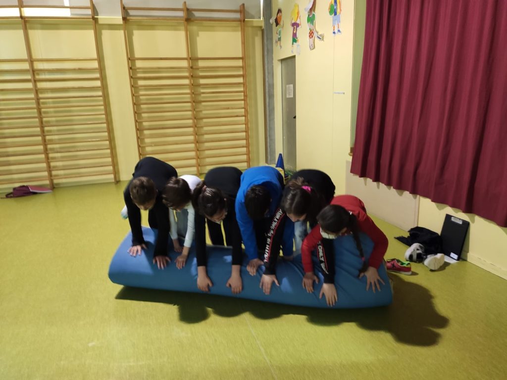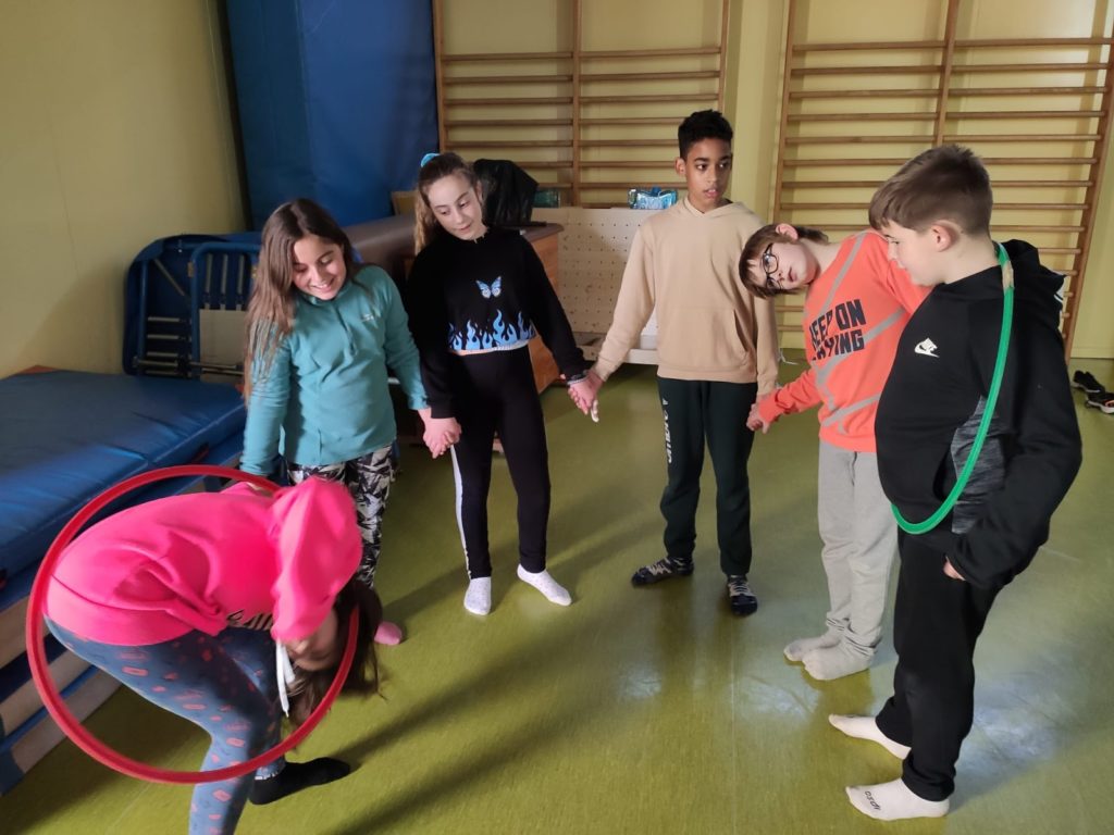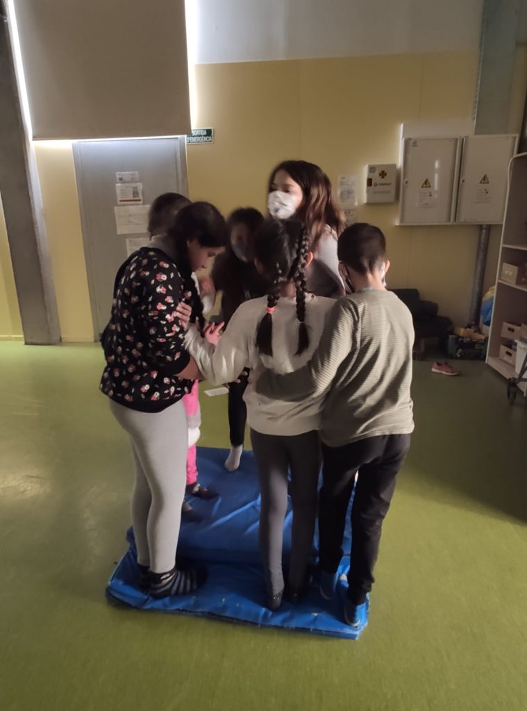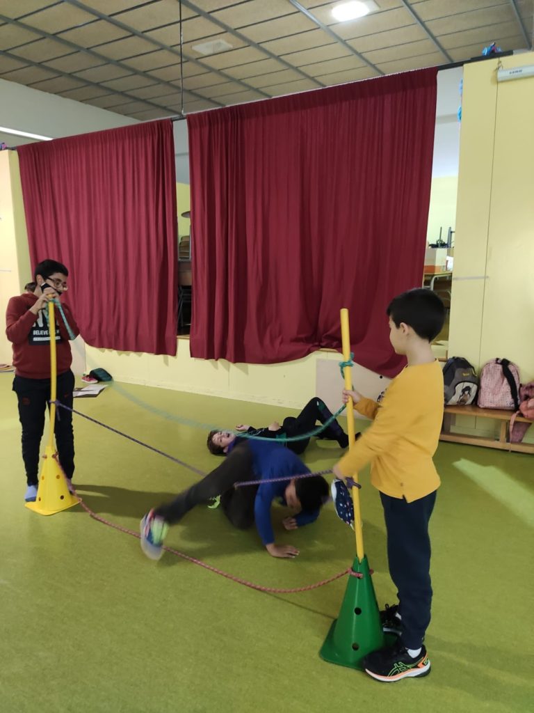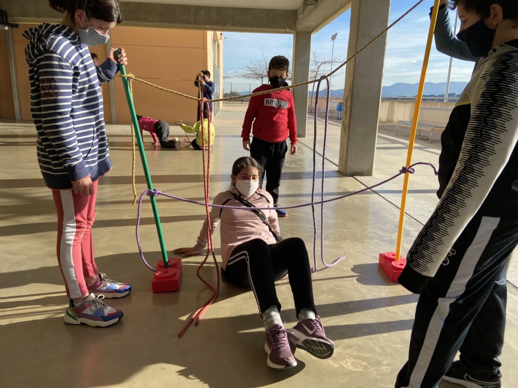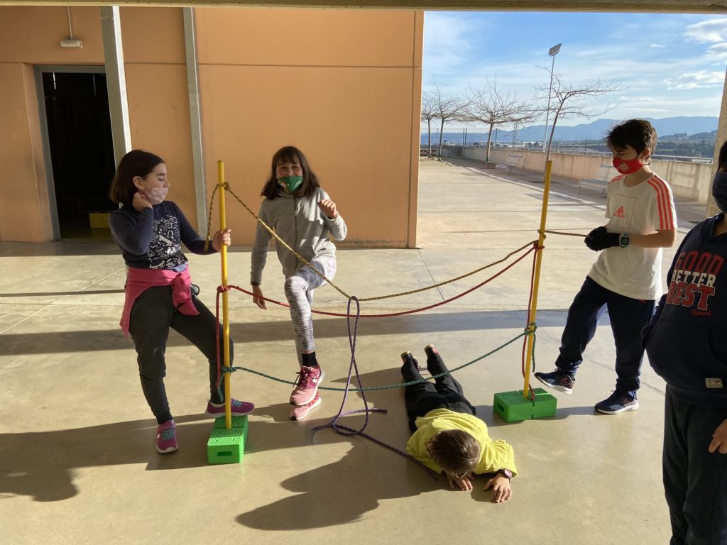 Compartim unes quantes imatges de l’alumnat cooperant i treballant en equip per a resoldre els reptes motrius.
