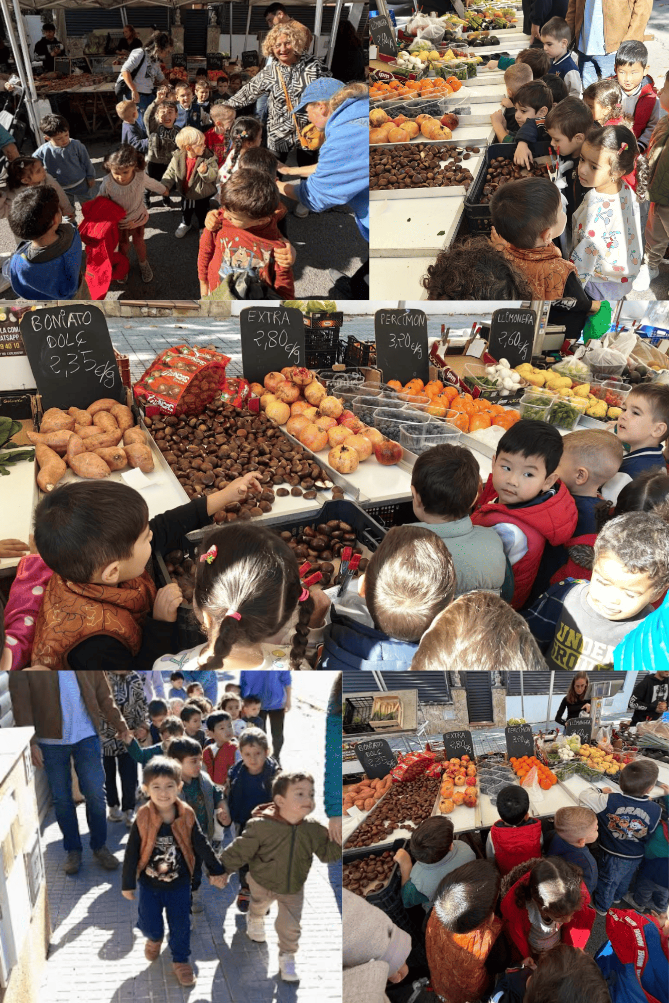 Durant la visita al mercat del poble, els infants observen colors, olors, formes i molta varietat de fruites. Participen activament en la compra i viuen l’experiència amb entusiasme. En tornar a l’aula, recordem tot el que hem vist i comprat, i compartim emocions i observacions. Aquest moment ens ajuda a ordenar l’experiència i a donar-li sentit dins del projecte.
