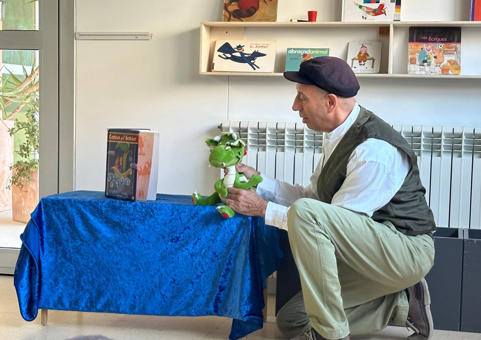 I la celebració no es va acabar aquÃ! Dimecres vam rebre la visita d’un contacontes molt especial que ens va explicar una història de Sant Jordi diferent de la tradicional. En aquest conte, el drac no feia por… al contrari! Era un drac bo que només volia fer amics i ho aconseguia regalant roses a tothom. Una història plena de valors com l’amistat, la generositat i la importà ncia de no jutjar per les aparences, que va captivar grans i petits.