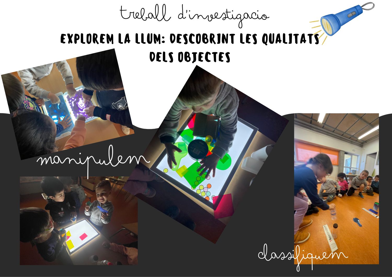 Hem experimentat a través de les taules de llum i de diferents objectes: alguns deixaven passar la llum i d’altres la bloquejaven. Els infants han experimentat, observat i han arribat a la conclusió que hi ha objectes transparents, però encara hem de descobrir com es diuen els objectes que no són transparents i no deixen passar la llum i altres objectes que deixen passar la llum però de colors.